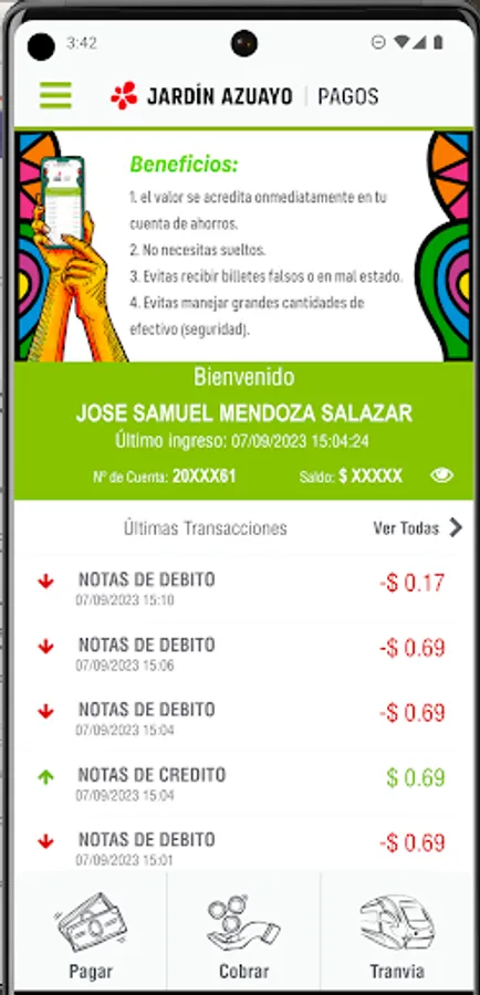 Jardín Azuayo Payments is an application through which payments and collections can be made easily, quickly and safely, between members of the Cooperative and the COOPAGOS NETWORK; In addition, inquiries about the latest transactions made in your account.