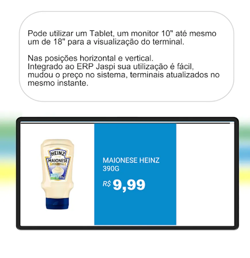 The terminal configuration can be portrait or landscape, using a tablet or smartphone of different sizes, and a barcode reader coupled to the equipment.