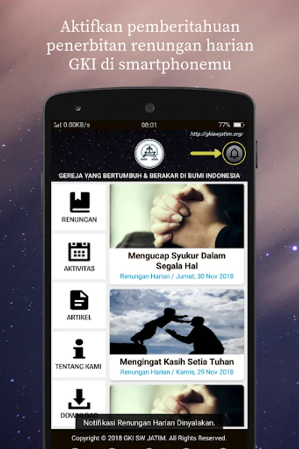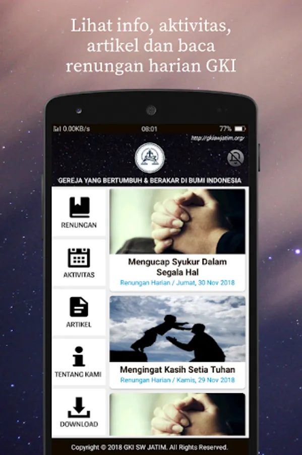 Official application of the GKI East Java Regional Synod. Available features are daily devotions, ecclesiastical activities and immediately follow the others