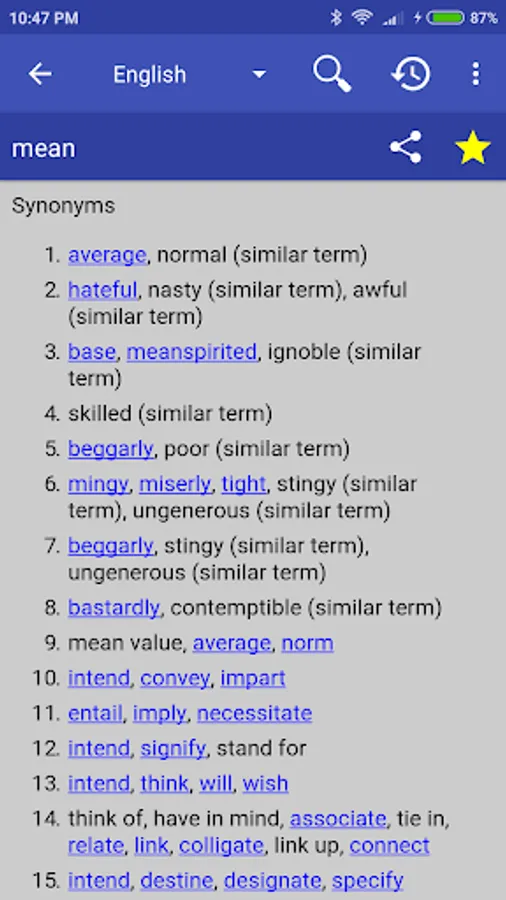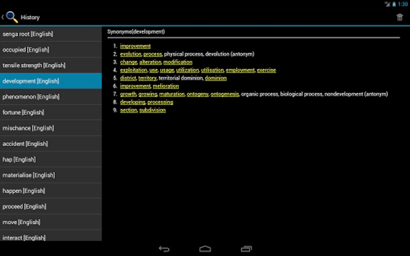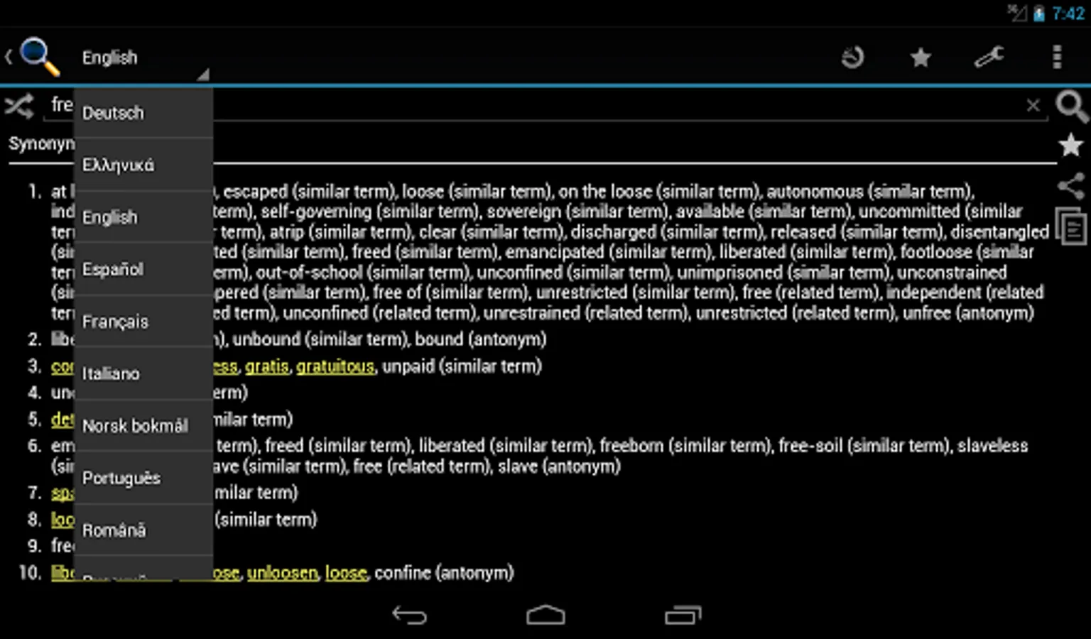 Good app with 2 major issues: 1. Cannot be used offline 2. Contains no antonyms (at least for Italian, German, Spanish)