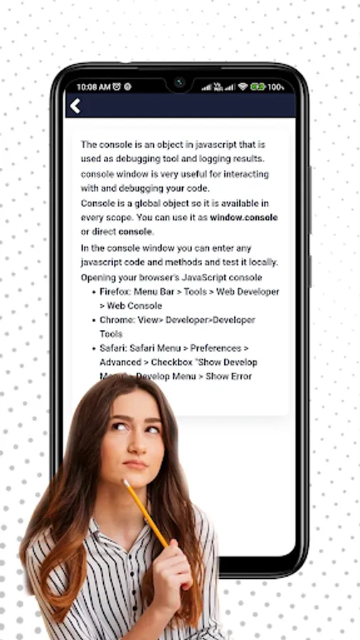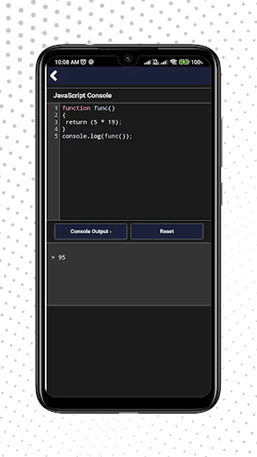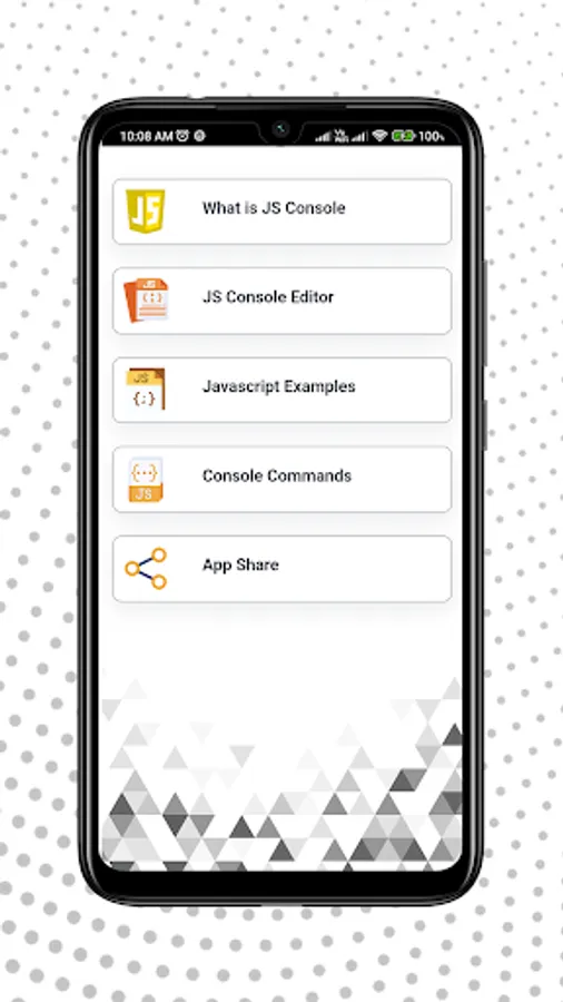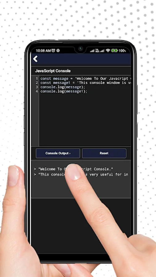 Javascript Console also can be called a js console, in the application we have designed the javascript compiler to compile any type of javascript code. Also, this learn javascript pro application is having some examples for easy to learn and understand the users. So the user can easy to learn javascript programming in two days.
