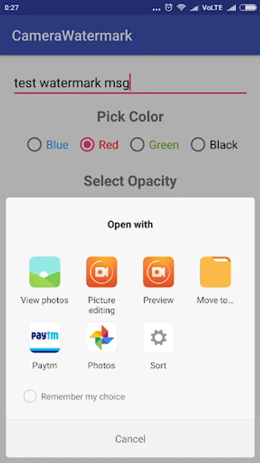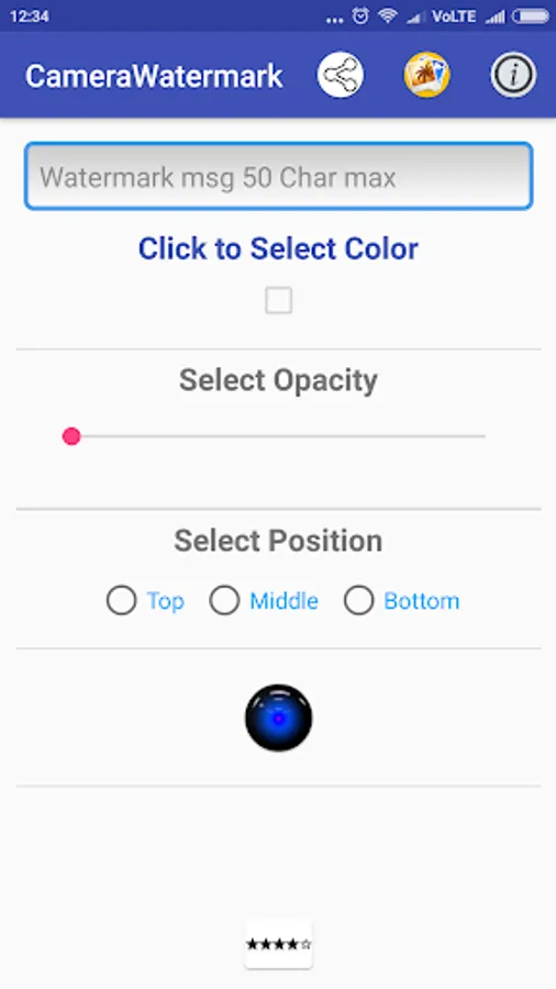 Camera Watermark app for instant watermarking images. Instant photo watermarking app with original picture quality. Use Camera Watermark application to click pictures with watermarking text. Use this app to taking pictures with watermarking text. This app also provide options to select color, opacity & position of the watermarking text.