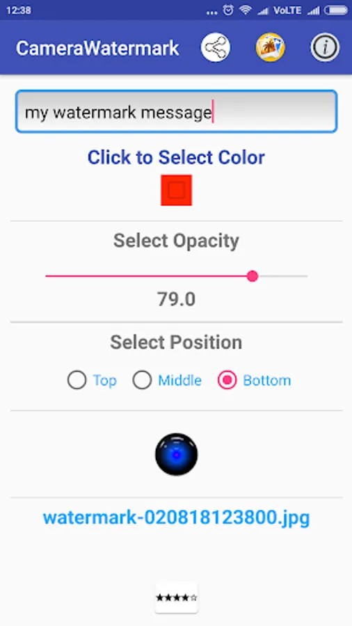 Capture memorable moments with the watermark message using Camera Watermark application. Share watermarked photos with friends. This app is fastest and easiest way to watermark images. No need of photo editing or image editor tool for watermarking.