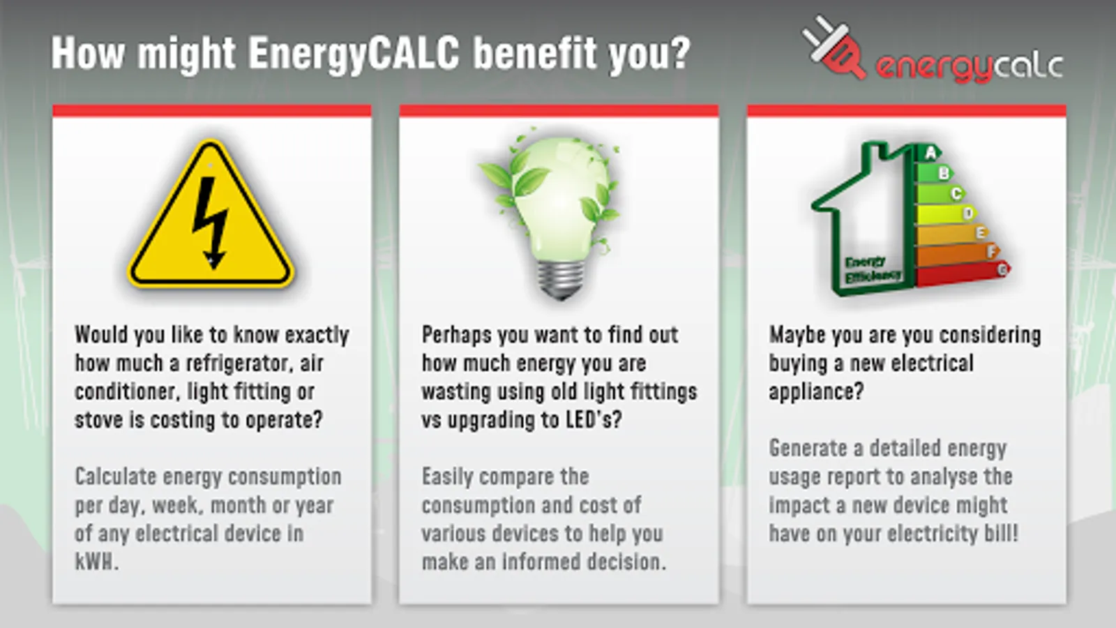 • Would you like to know exactly how much a refrigerator, air conditioner, light fitting or stove is costing you to operate? EnergyCALC is the smart way to calculate the estimated electricity consumption per day, week, month or year of any electrical device in kWH.