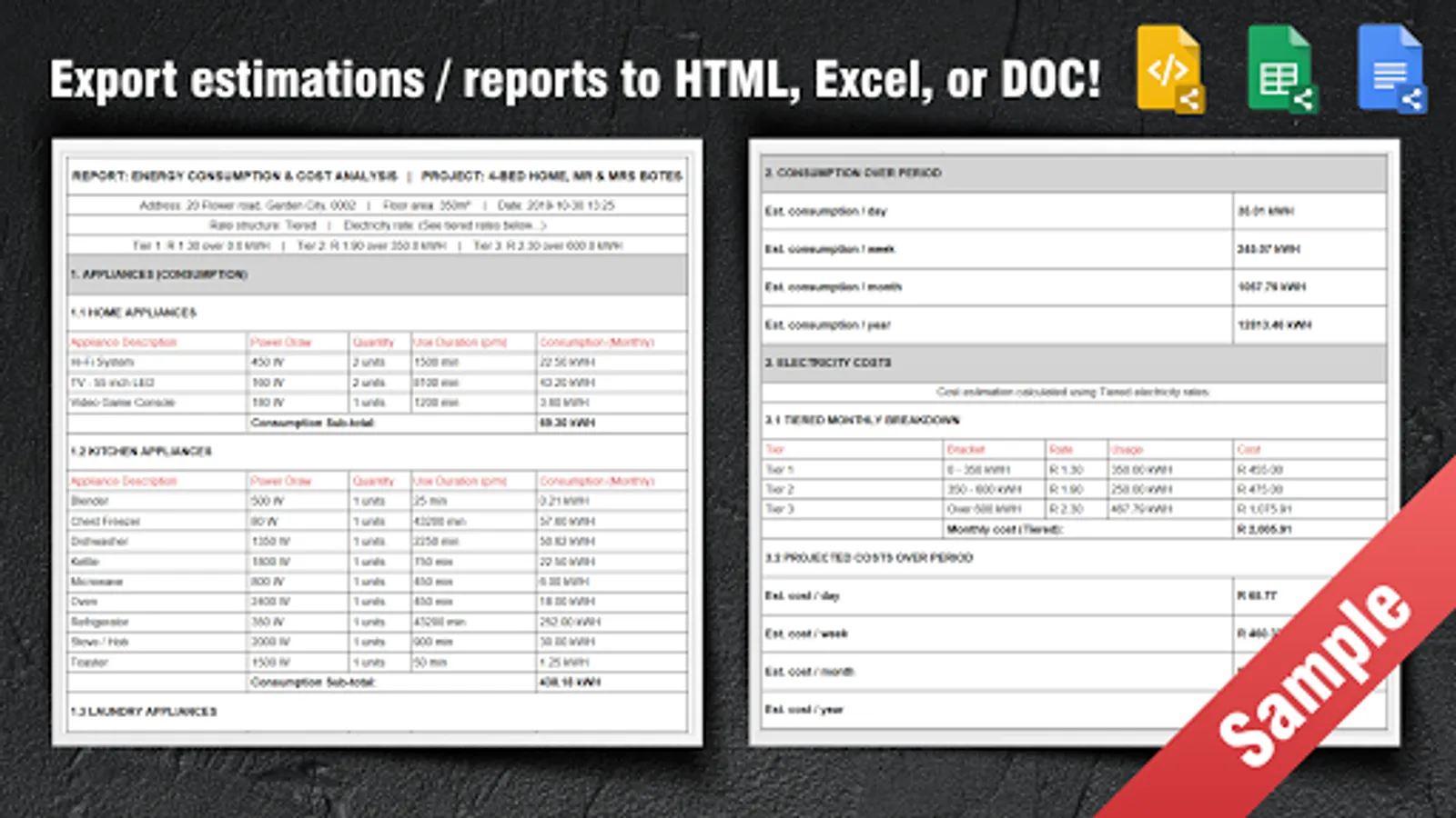 EnergyCALC will automatically do all the energy usage & electricity rate calculations, based on the data entered and generate a detailed report in a clean and professional layout! The layout can then be shared as an HTML table, CSV data for excel spreadsheet or DOC for printing.