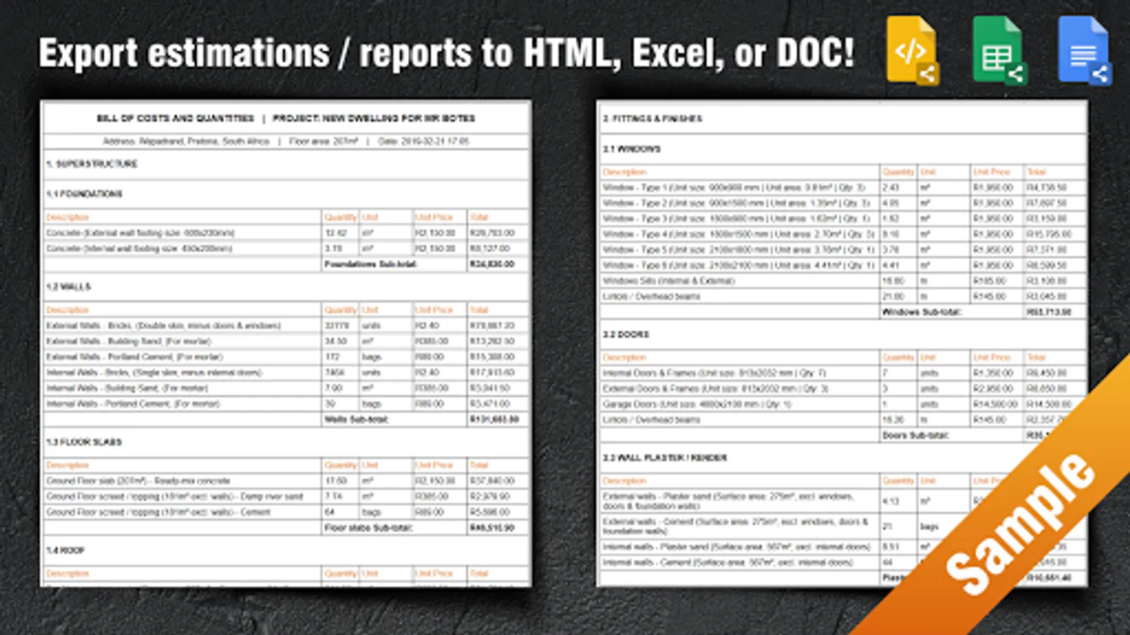 QuantiCALC is a simple, but powerful building / construction estimation & costing system designed for use by general contractors, DIY builders, architects and quantity surveyors. The app allows you to quickly create professional cost & quantity estimates for small to medium sized masonry construction projects. With only a few taps of your finger you can add some cost items, enter the specs and quantities, and generate a detailed bill of costs and quantities for your next construction project in no time!