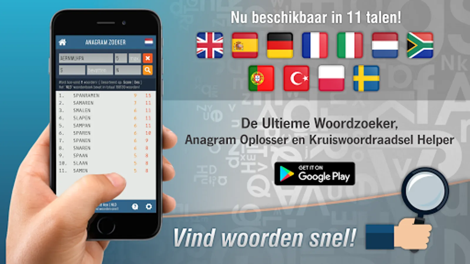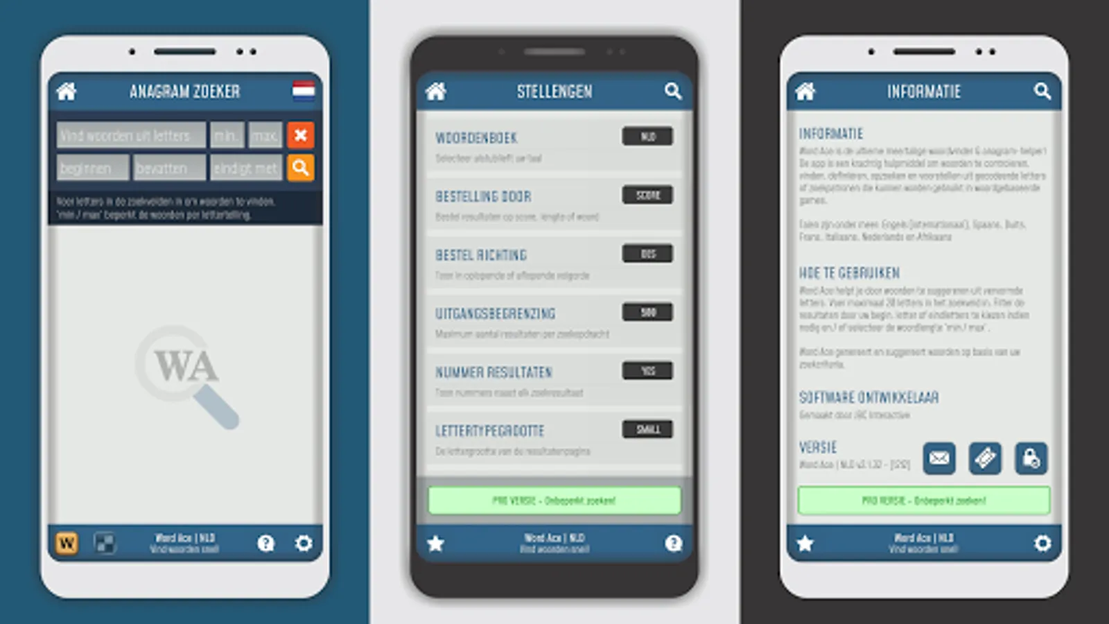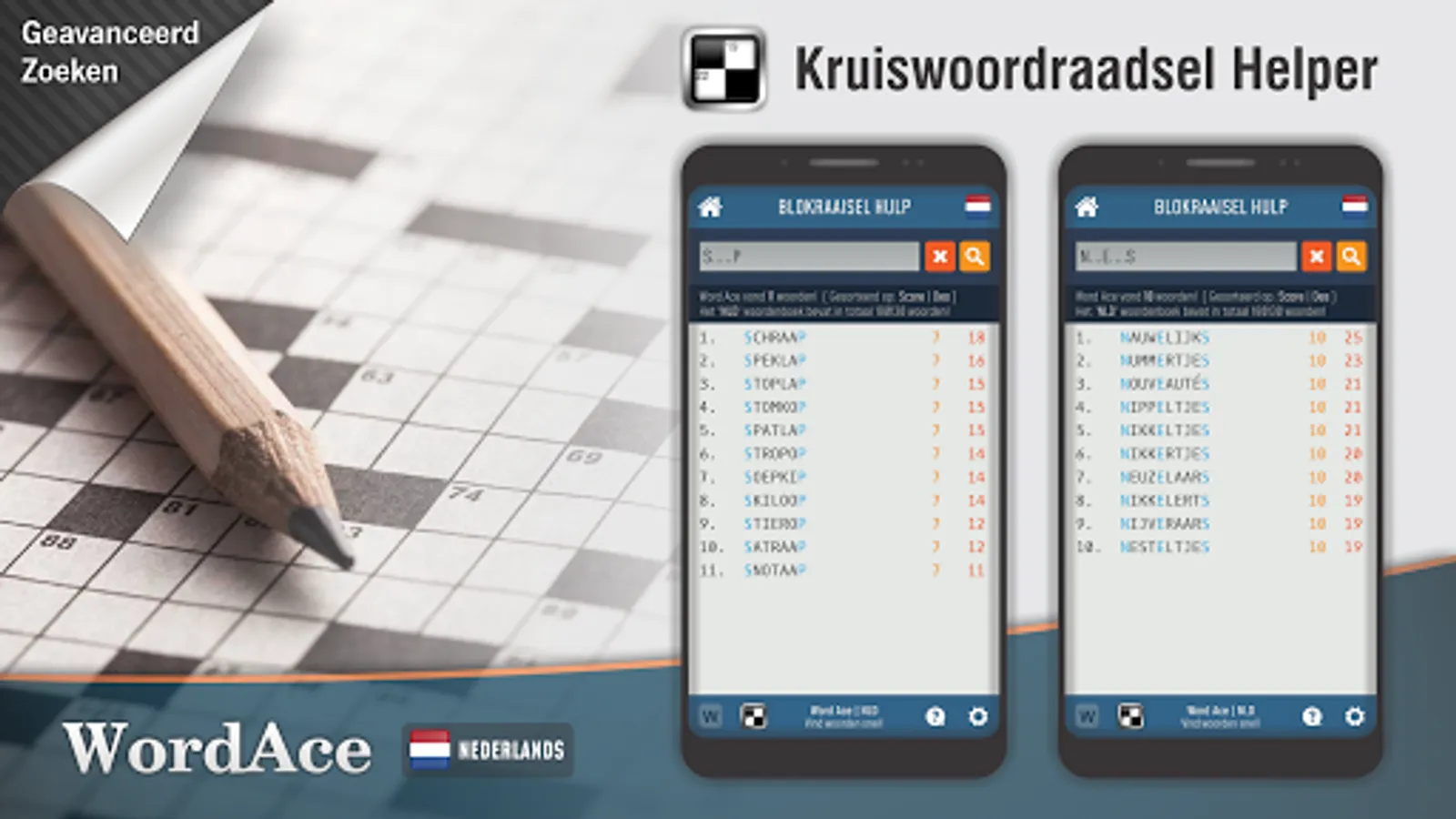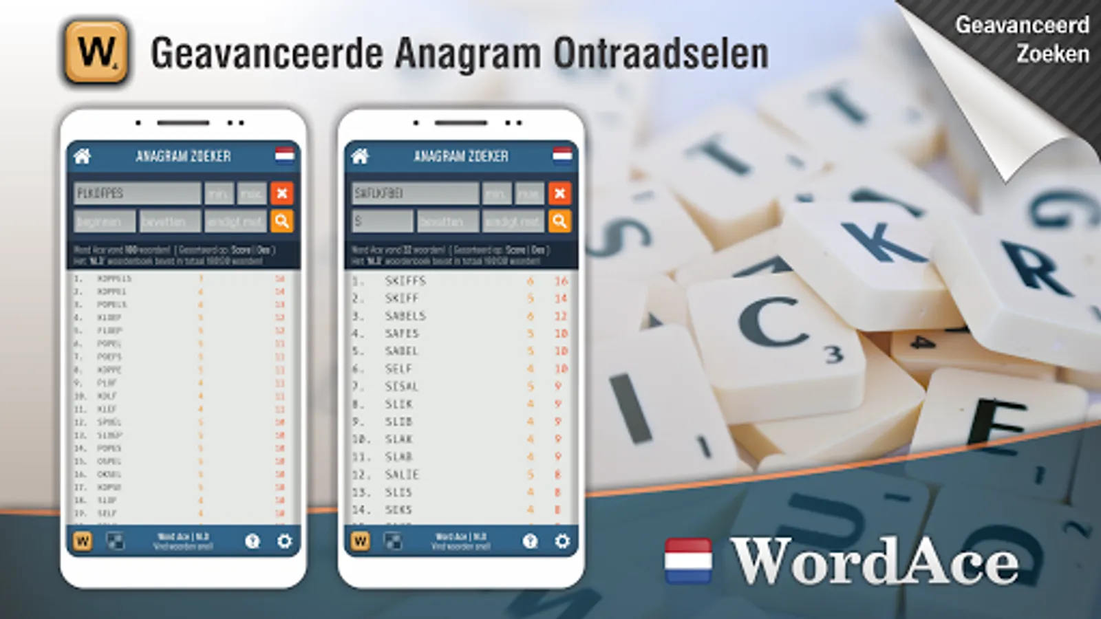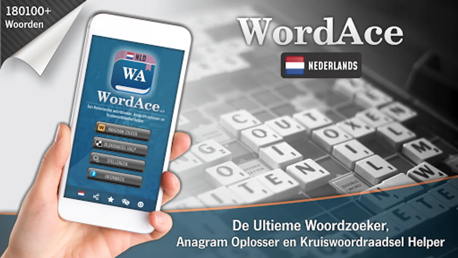 WordAce is the ultimate Dutch dictionary, word finder, anagram solver and crossword puzzle helper. The app is a powerful tool to find and suggest words from scrambled letters or search patterns in the dictionary that can be used in various word based games.