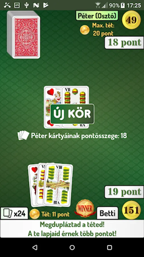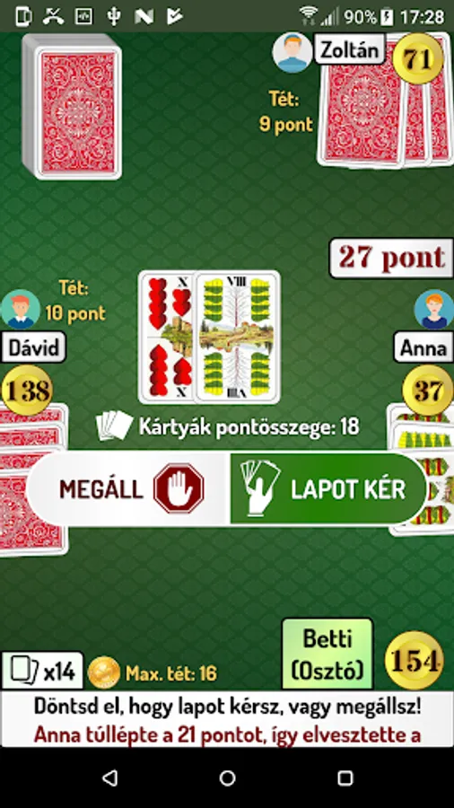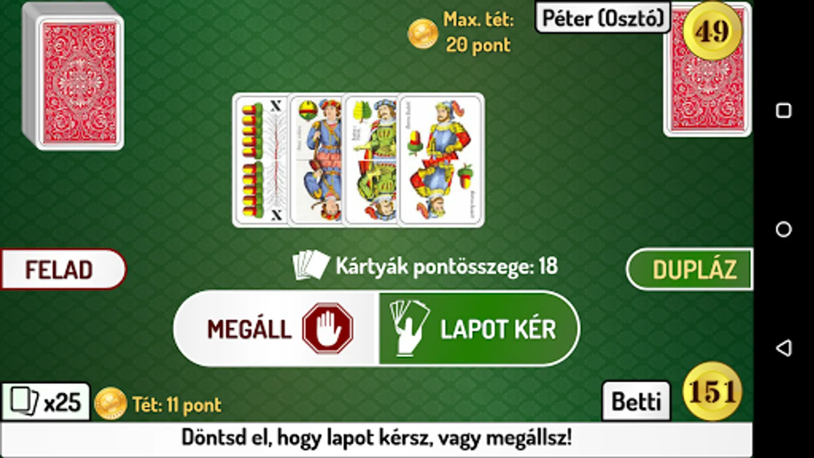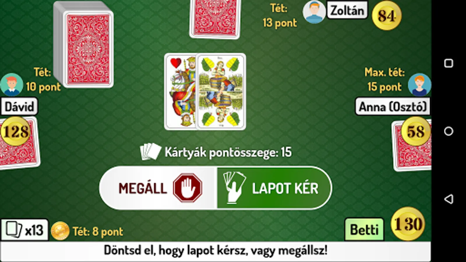 Short, fast-paced game with a Hungarian card. You can choose from two game modes: single player (against the dealer) and four player.
