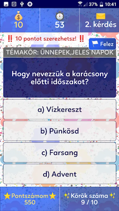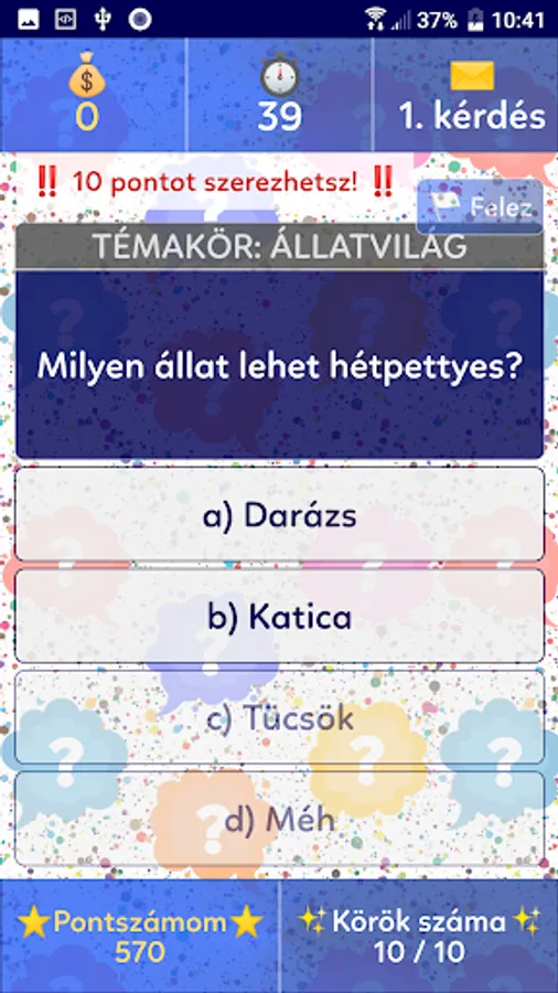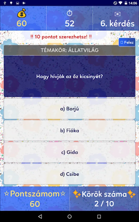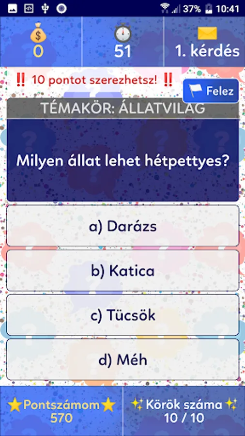 You get 10 points for each correct answer. Exceptions are questions 5 and 10, for which 20 and 50 points are awarded. After the correct answer, you can decide: stop and keep your points, or move on and risk your points halved if you answer incorrectly. You can answer up to 10 questions in a row.