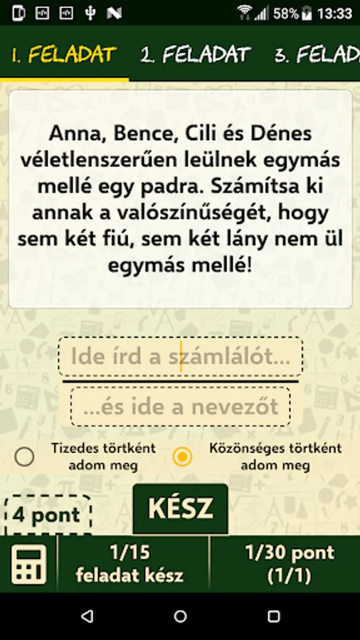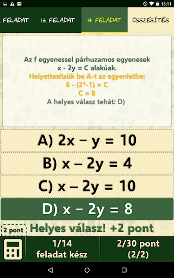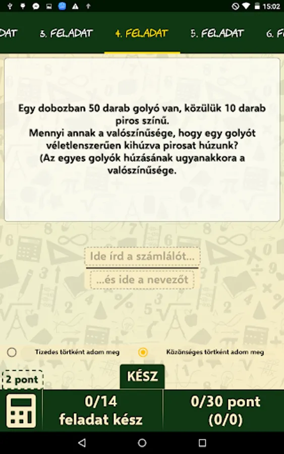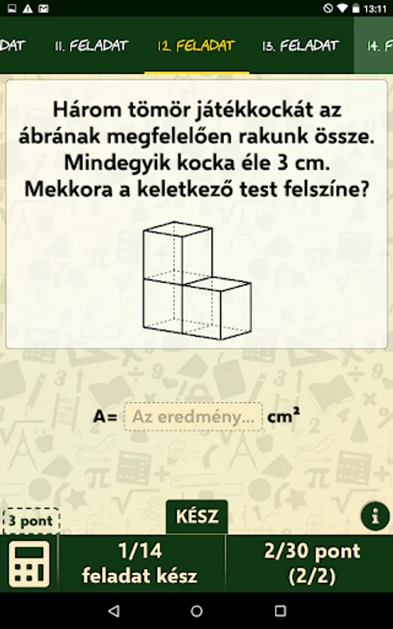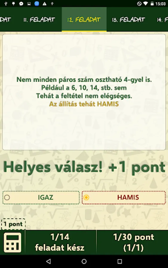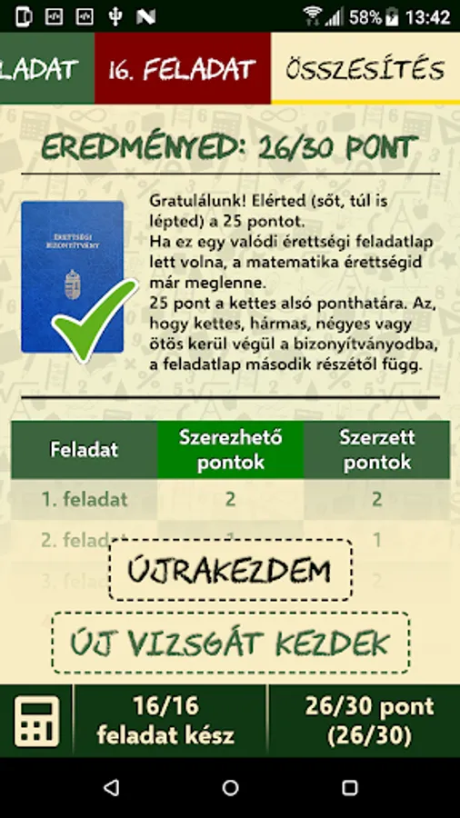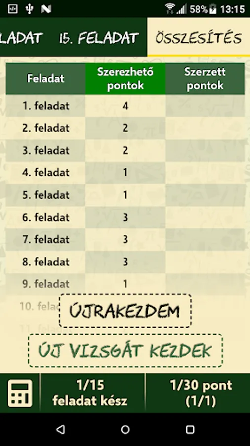 Tasks were collected from the mid-level matriculation examinations in the past 14 years. The application compiles 30-point tests from these tasks, which are similar to the first mathematics matrix. You can restart the actual test at any time and start a new test. Tasks can be loaded in any order. For most tasks, there is also an explanation, or where you need it, you can look at the formula you need for the solution. The application provides statistics on completed (completed) tests.