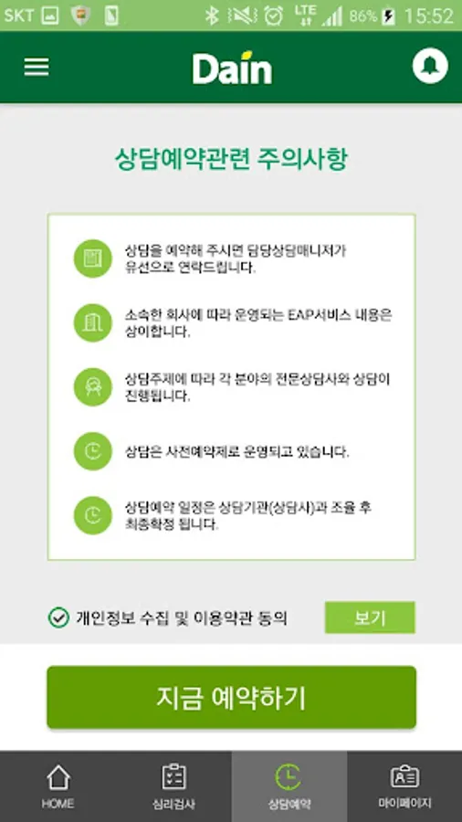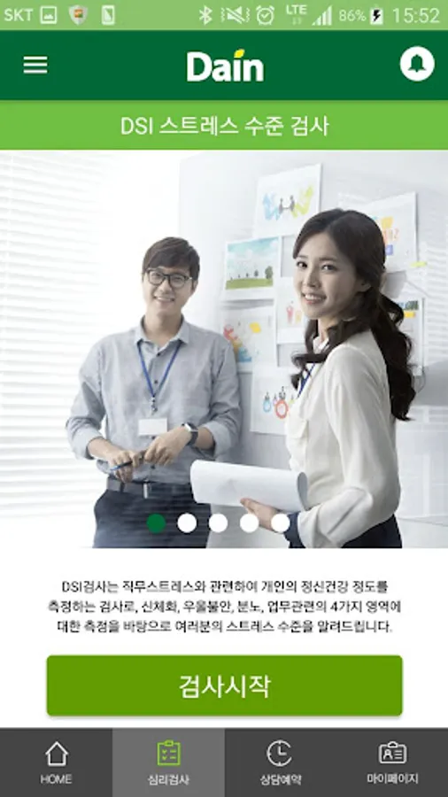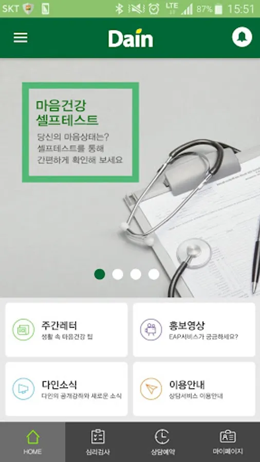 EAP specialist, Ltd. Dain provide psychological diagnostic applications as stress, job stress, happiness, marriage satisfaction, you can scan various types of tests conducted in love. You can also apply for a consultation and management of various subjects through the appointment system after the inspection aimed at getting their employees provide EAP services.