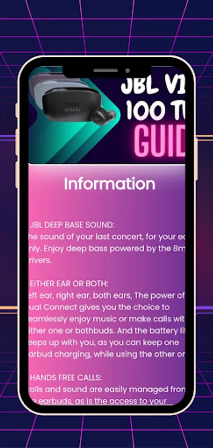 To find out more information on how to use the JBL VIBE 100 TWS, download the JBL VIBE 100 TWS Guide app. Our mobile application lets you know what you are wondering about JBL VIBE 100 TWS.