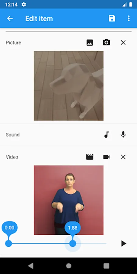 - Video: pick a clip from your device or use your camera from within the app to record a video. The video will be played when you tap on the item. If the item doesn't have a sound clip, the video's audio will be played too. You can also customise a start and end point within the video to be played, handy if you're recording video yourself so you don't have to get that perfect take first time!
