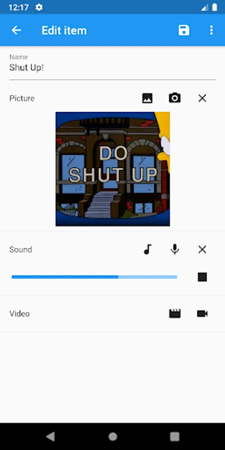 - Sound: pick an audio file that's on your device, or use your your microphone from within the app to record a sound clip. The audio file will be played when you tap on the item.