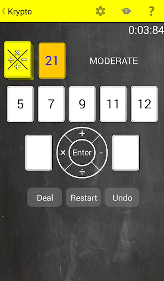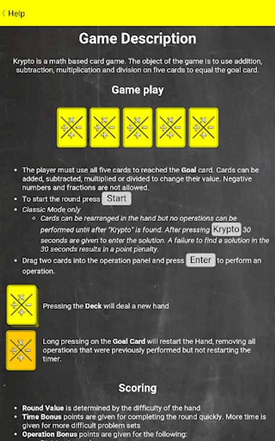 Krypto is a math based card game. The object of the game is to use addition, subtraction, multiplication and division on five cards to equal the goal card.