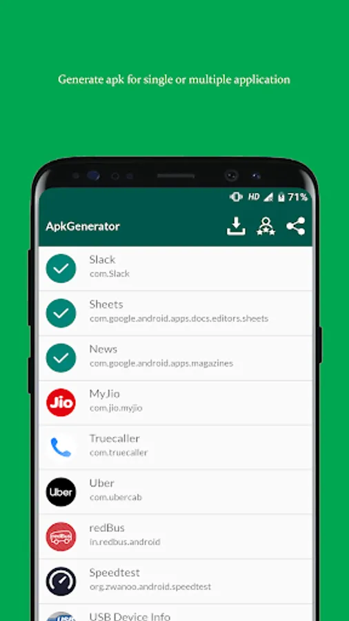 APK Creator is generating or extracting application from installed application list. APK Creator is also save generated APK into internal storage. User can see all saved APK file inside APK Creator application and also install APK file ovre there.