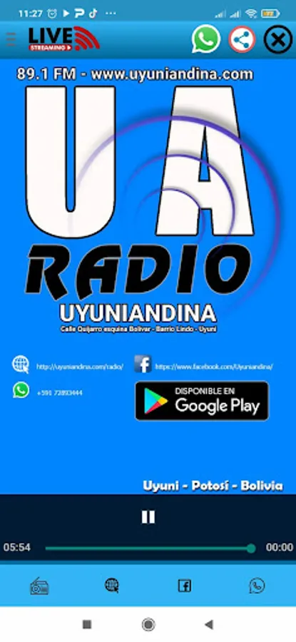 Radio station from the capital of the Antonio Quijarro province of the Department of Potosí, Bolivia, its programming is informative musical with endless features that make it the most listened to radio station in the region, thus being a benchmark in the region, transmits in Modulated Frequency 89.1, it also has a social network on Facebook and its own Web page, its address being http://www.uyuniandina.com/ its central studios are located on Quijarro street, on the corner of Bolívar - Barrio Lindo - Uyuni.