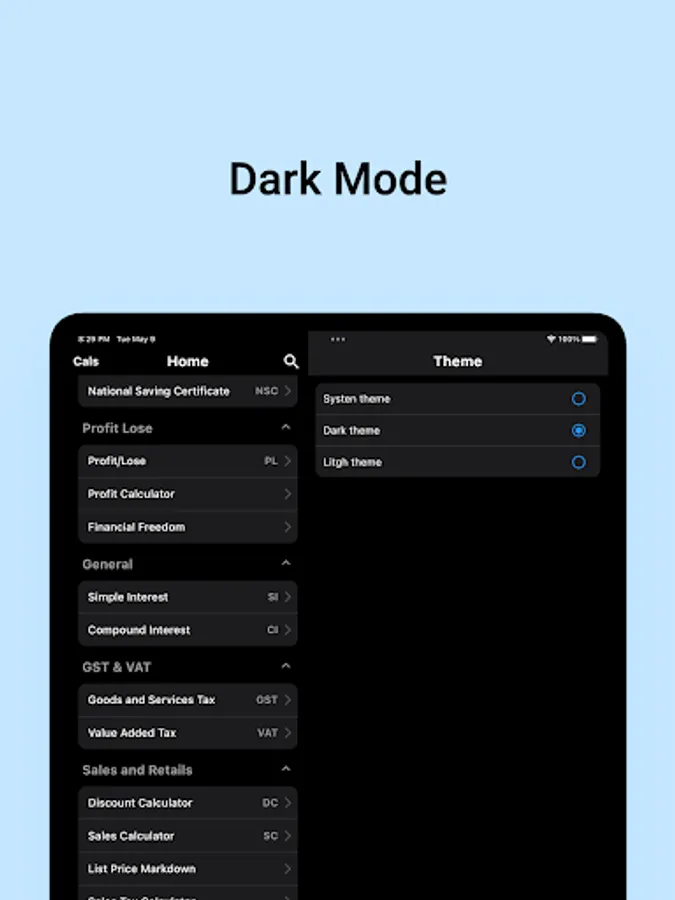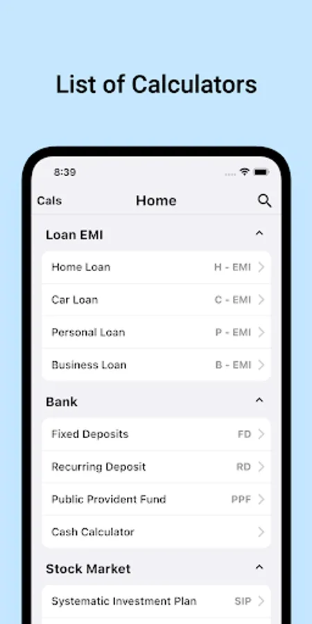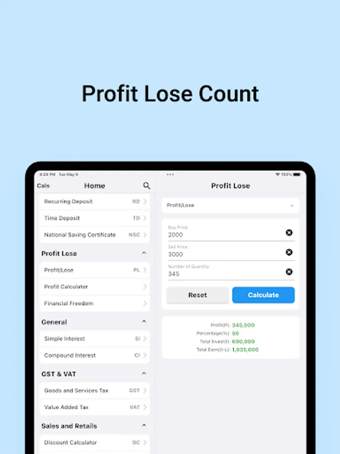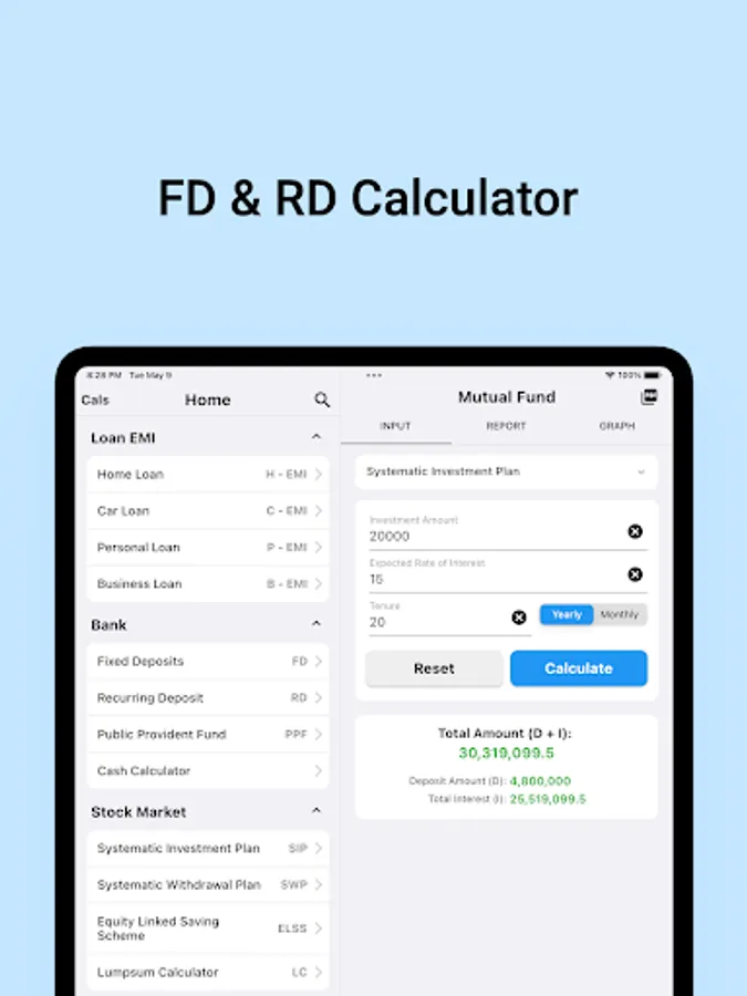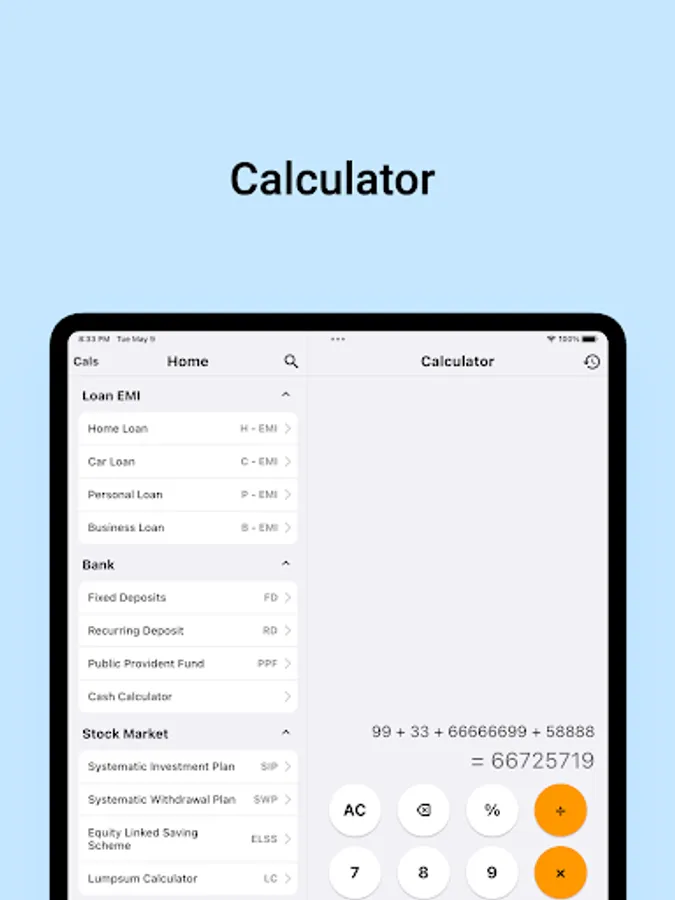 A financial calculator exclusively for Indians with the schemes available in Indian Banks, FD, RD, Post offices, Mutual Funds, SIP and SWP, share market, stock market, sales and retails, GST, Profit lose, and much more. This App provides the following calculators for both Mobile Phones and IPad.