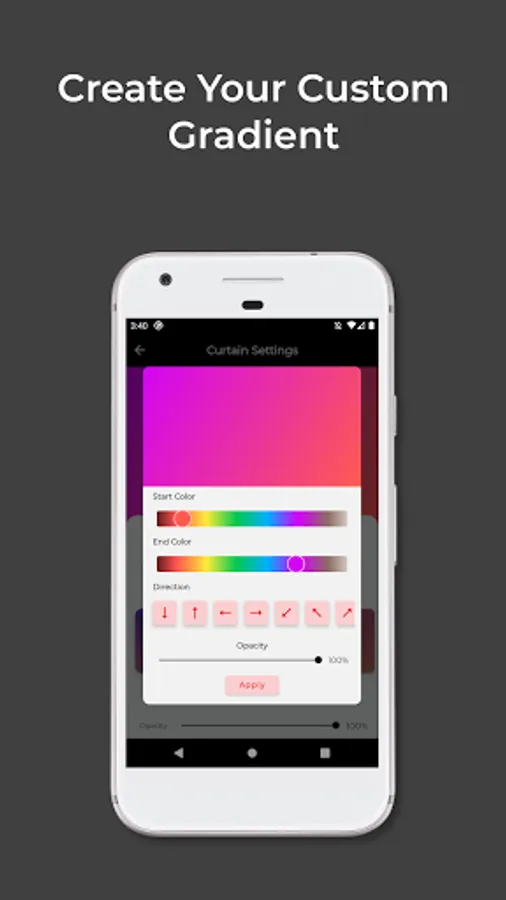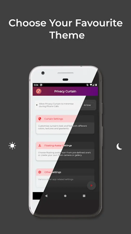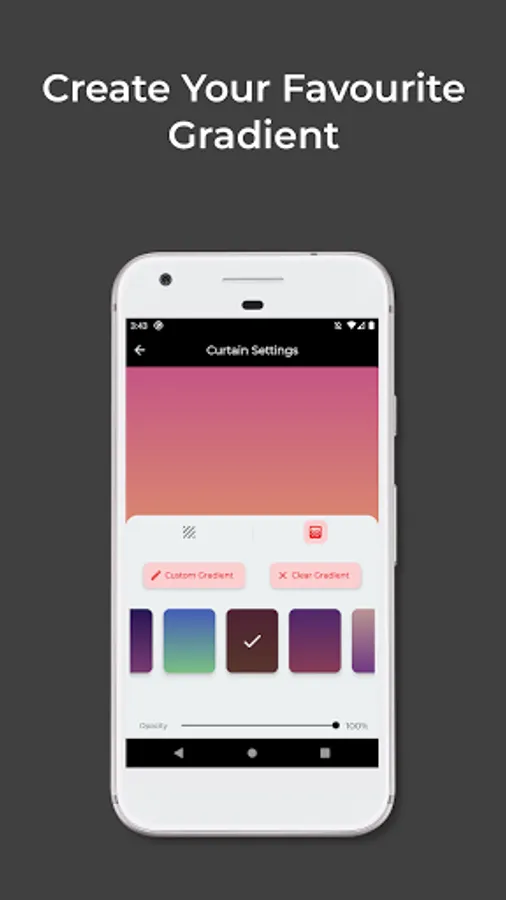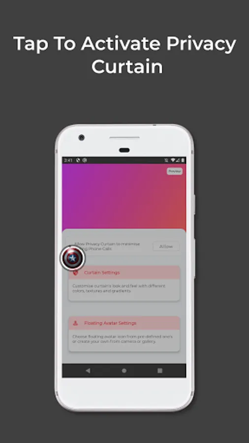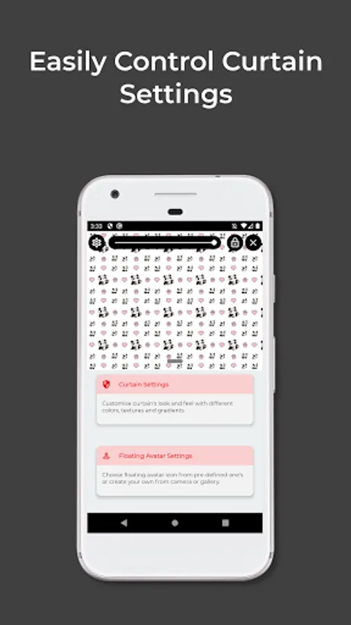 Privacy Curtain helps to guard your private content in public. It lets you use your phone confidently by covering your screen with digital Curtain. You can personalize it with your favorite colors or with provided textures and also you can set the level of transparency according to your liking. You can combine both color and texture to get different tint in every texture.