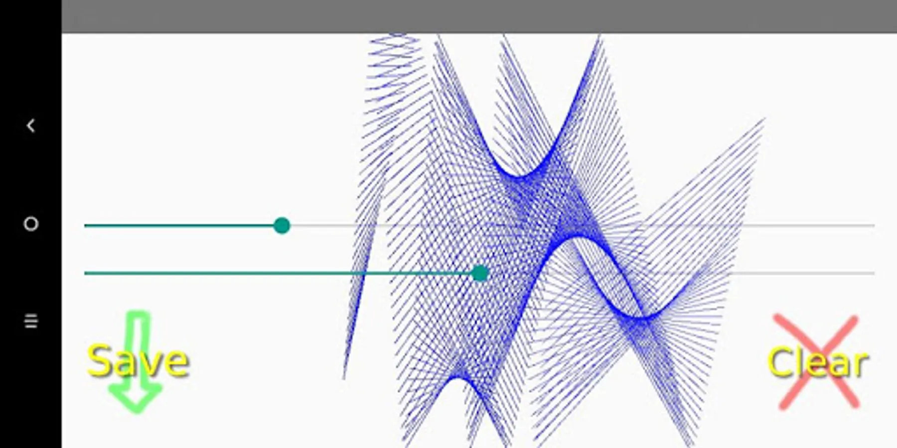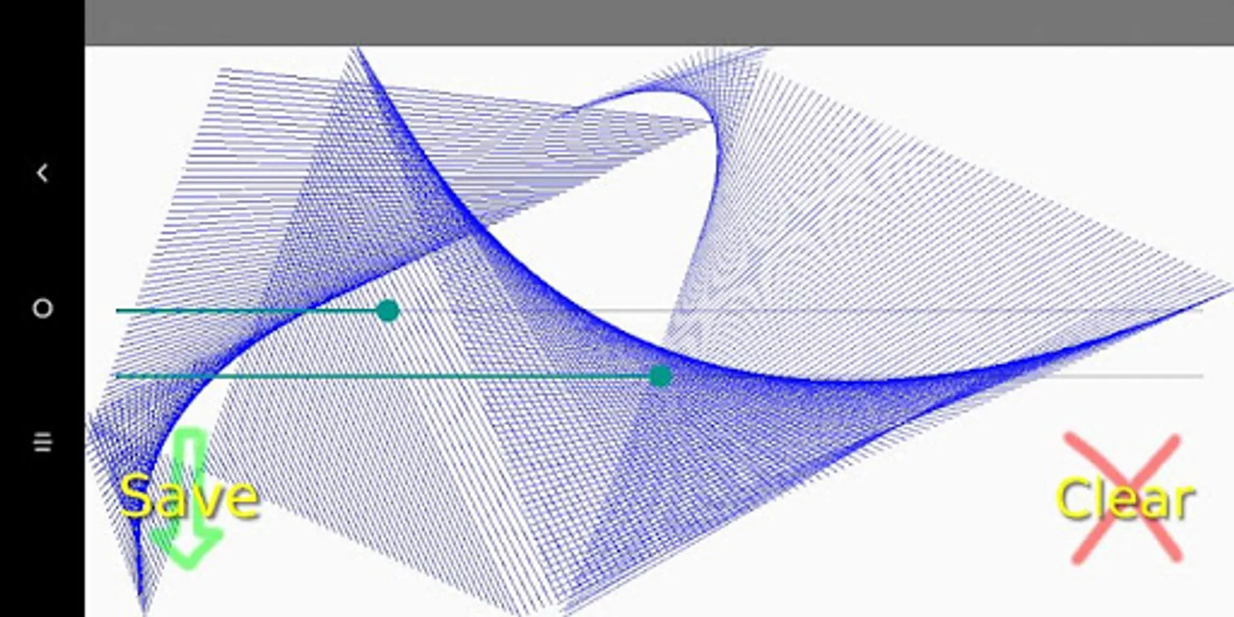 This app automatically creates straight Spirographic lines. Pictures can be saved. Touch screen to start / stop the Spirograph
