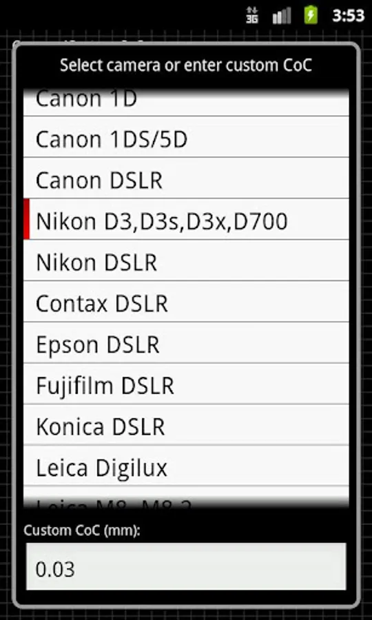 The unit of the calculated results as well as the focus distance can individually can be selected to be m, cm, feet or inch and all last used settings are saved.