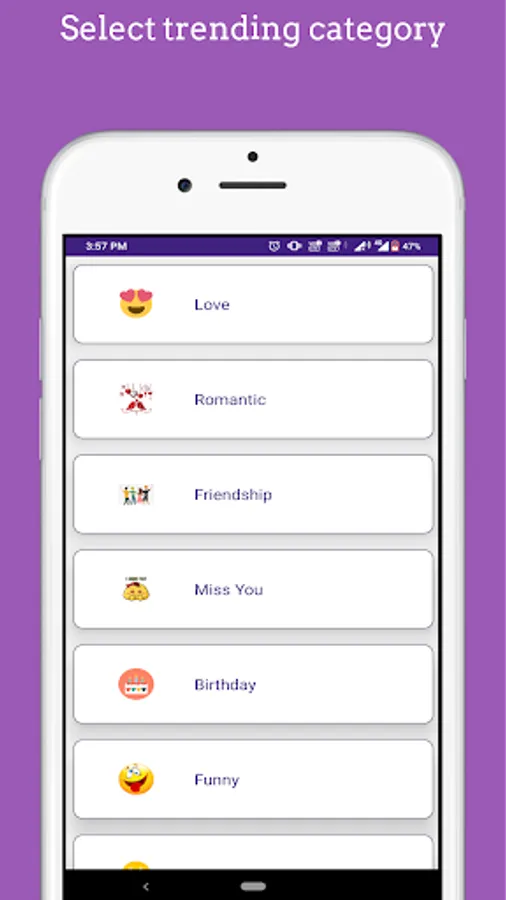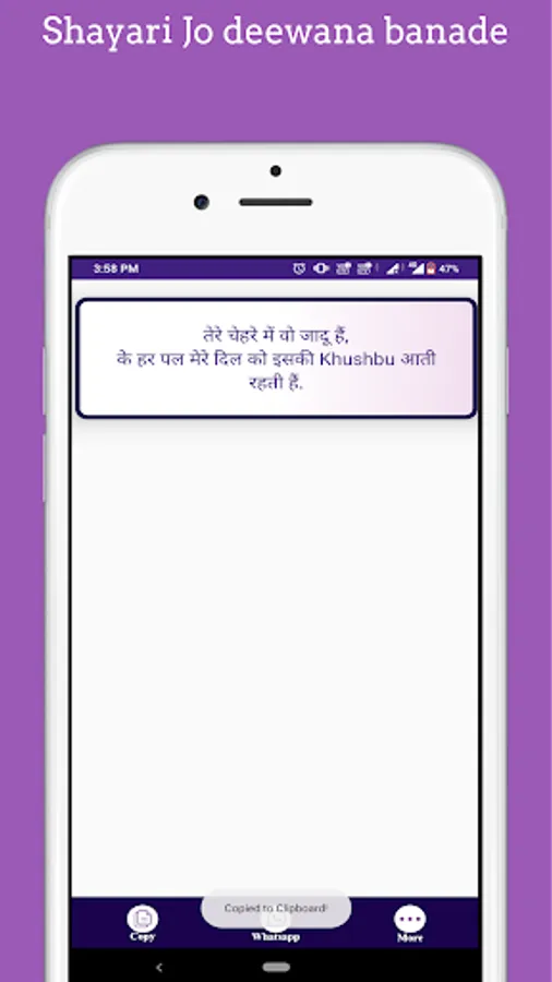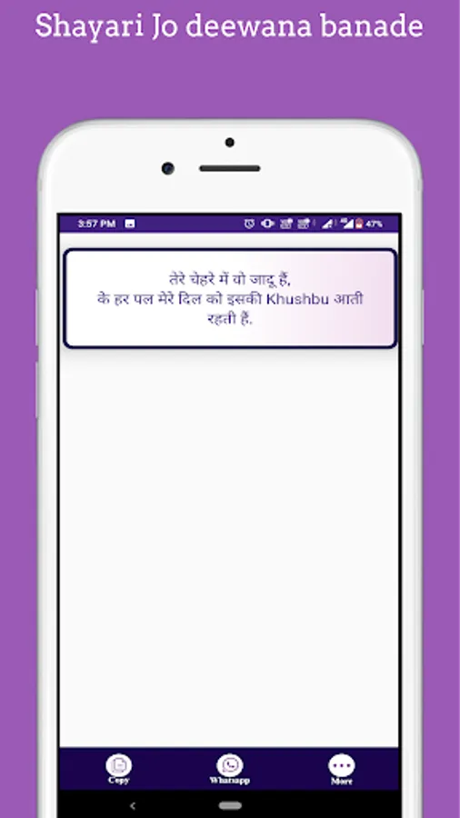 Find the Perfect Shayri to Share with your loved once through social networking or instant messenger apps.Very beautiful design and function for full enjoy of Shayari. This app have Shayari Arranged by Categories and you can Easy Make some Shayari for your favorite !