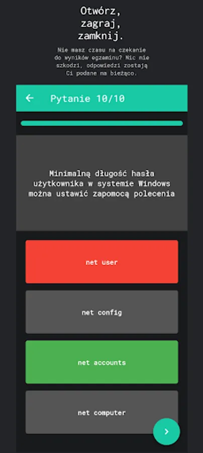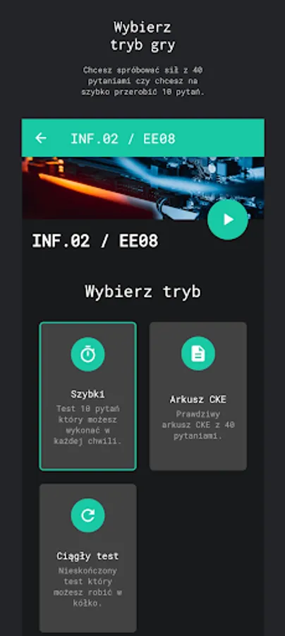 The Technik Informatyk application allows you to prepare for the exam using the modes available in the application. This solution works well during short 5-minute breaks and when you do not have time to complete the entire test.