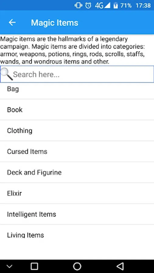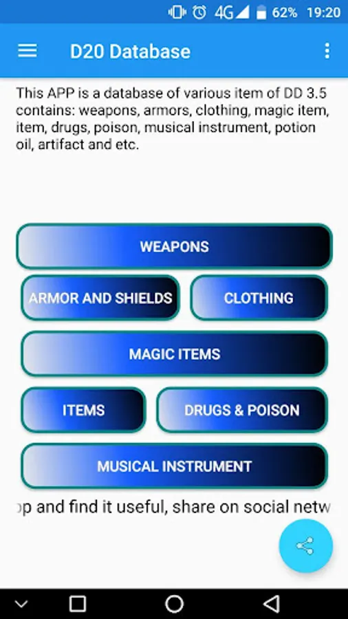 Of contains: weapons, armors, clothing, magic item, item, drugs, poison, musical instrument, potion oil, artifact and etc, and Character Sheets for DnD 3.5 is clean, simple and fast.