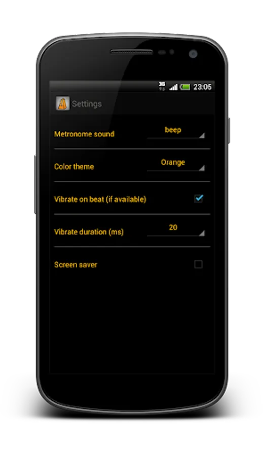 From the settings menu you can activate the vibration feature, change the sound of the metronome or even set the color theme. These features helps when you are live on stage and need a discrete tempo indication.