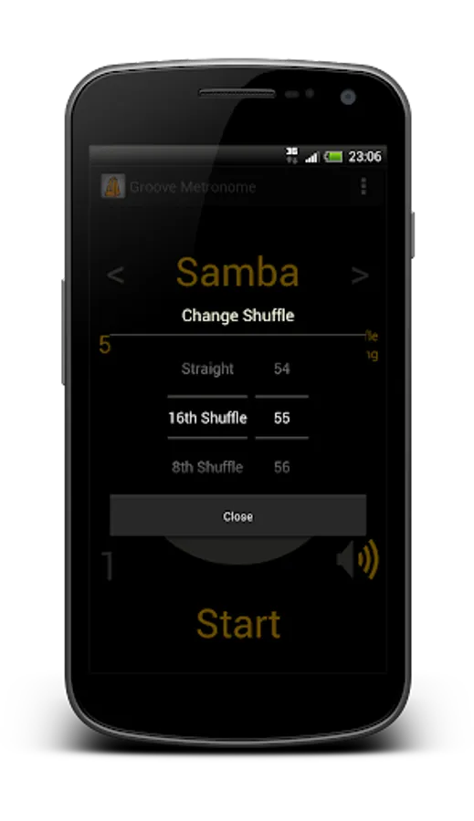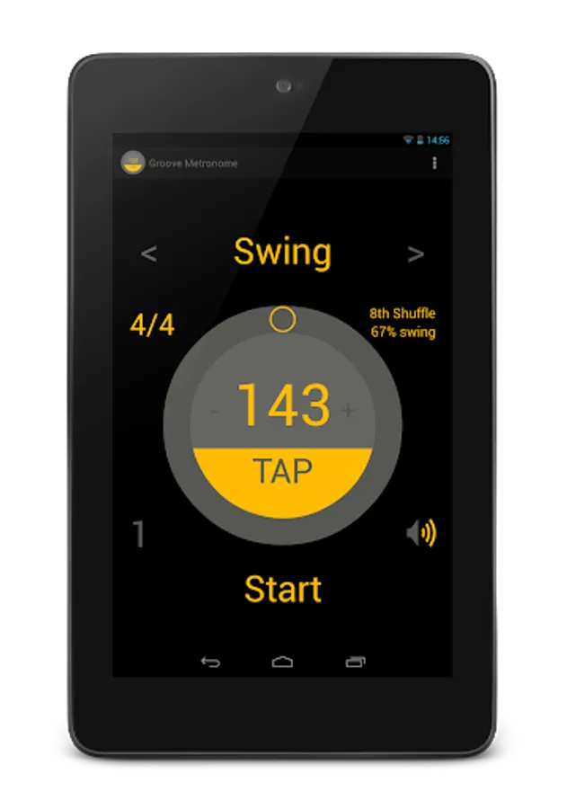 While the metronome is playing you can still modify parameters like tempo, time signature, shuffle and freely customize the swing level. You can set the swing on either eighths or sixteenths.