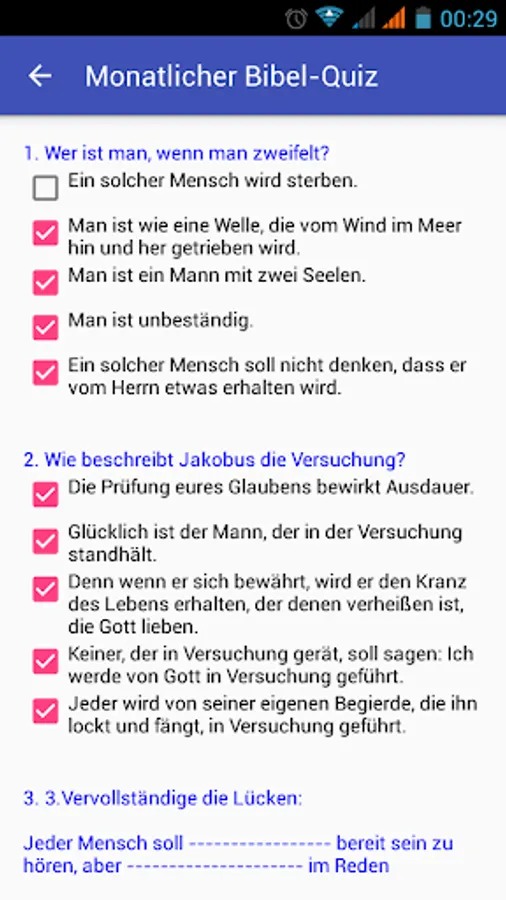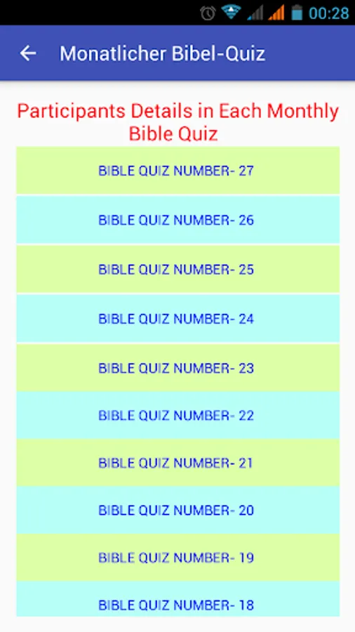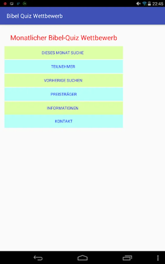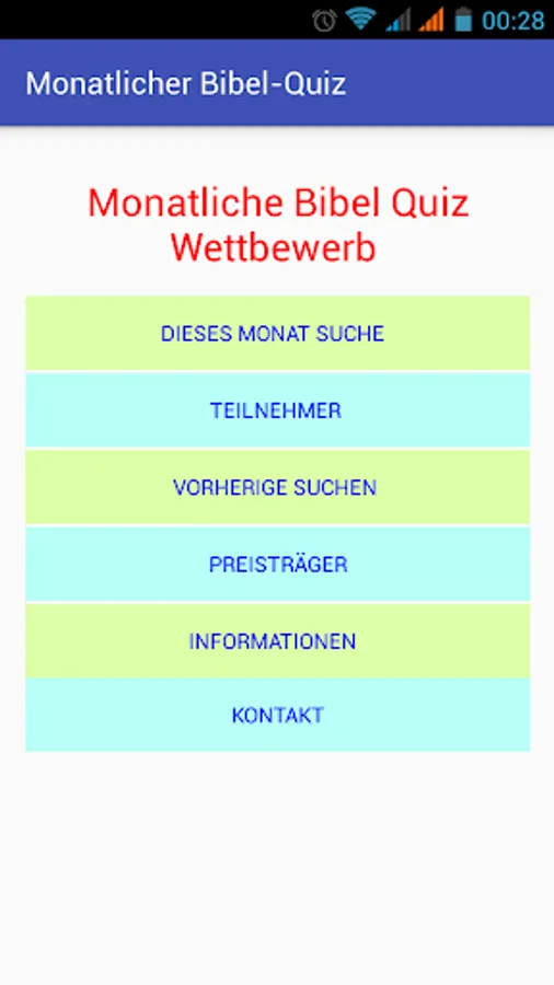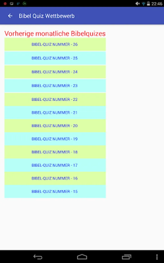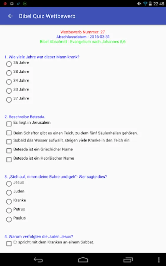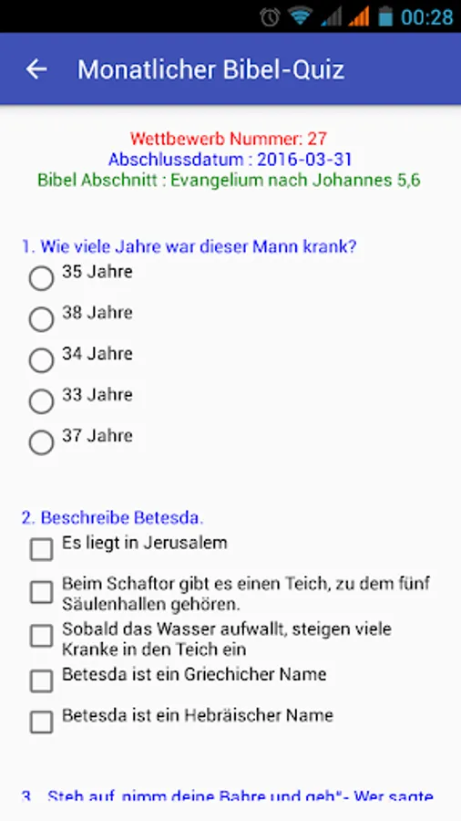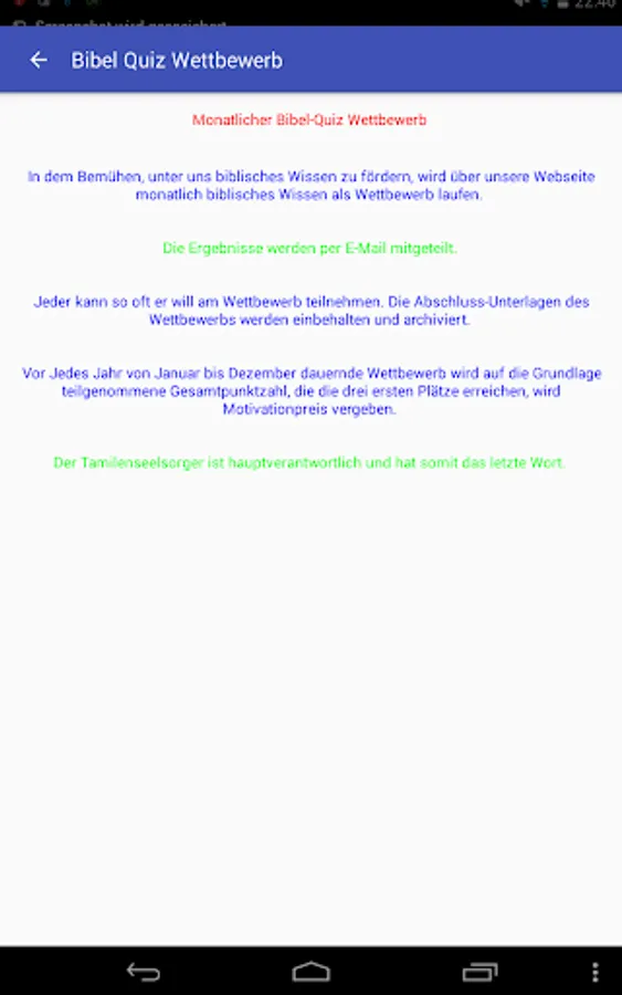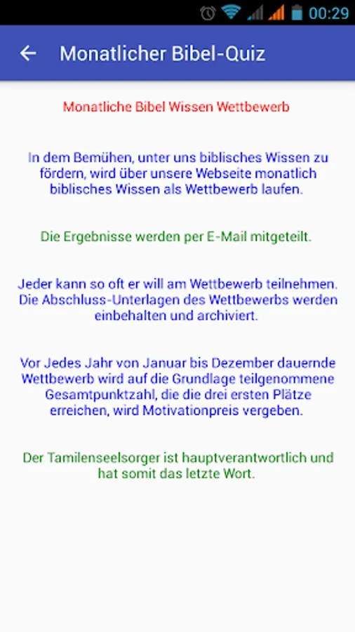 In dem Bemühen, unter uns biblisches Wissen zu fördern, wird über unsere Webseite monatlich biblisches Wissen als Wettbewerb laufen.Die Ergebnisse werden per E-Mail mitgeteilt. Jeder kann so oft er will am Wettbewerb teilnehmen. Die Abschluss-Unterlagen des Wettbewerbs werden einbehalten und archiviert.