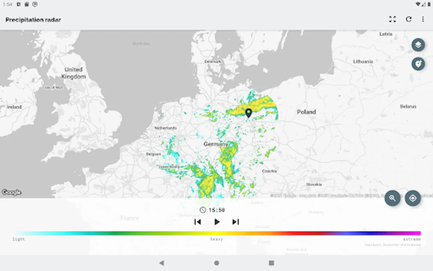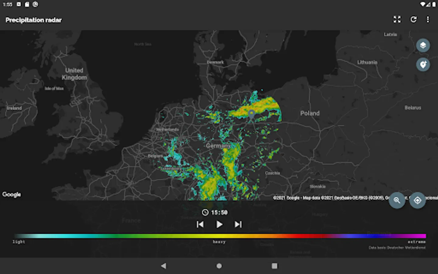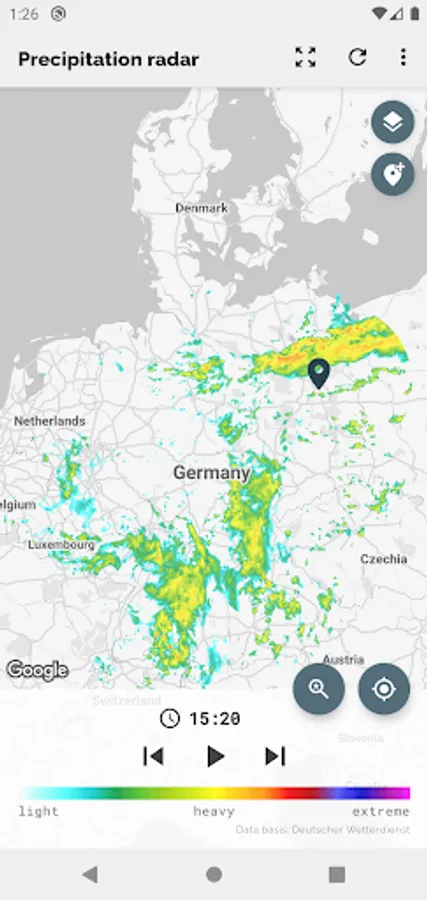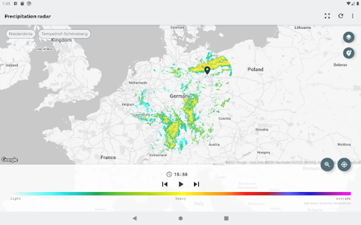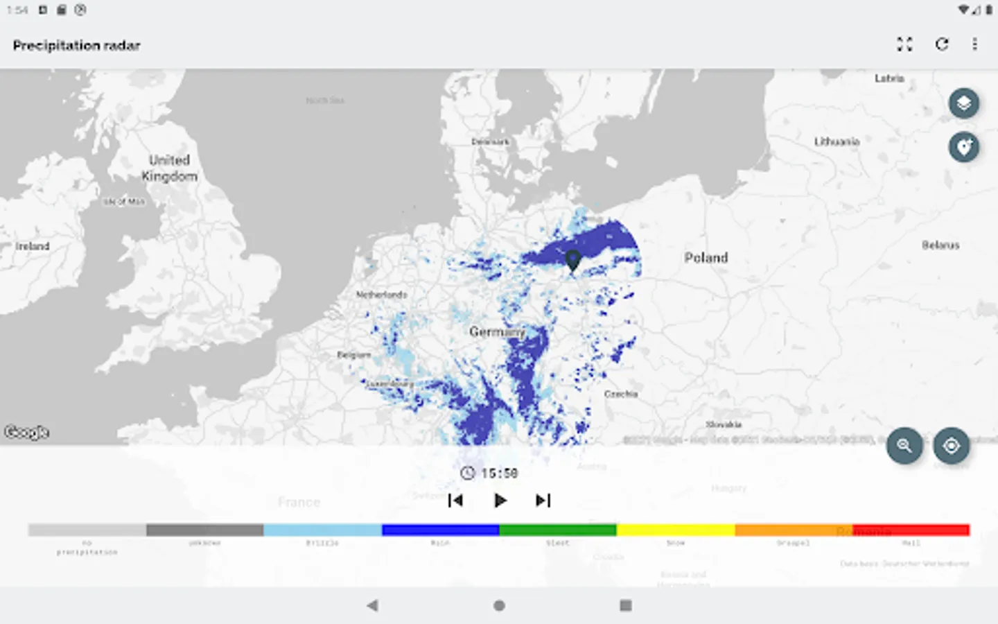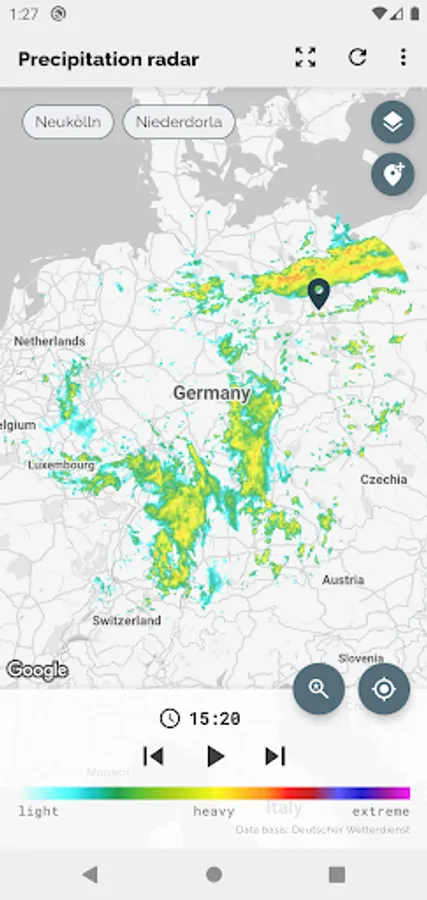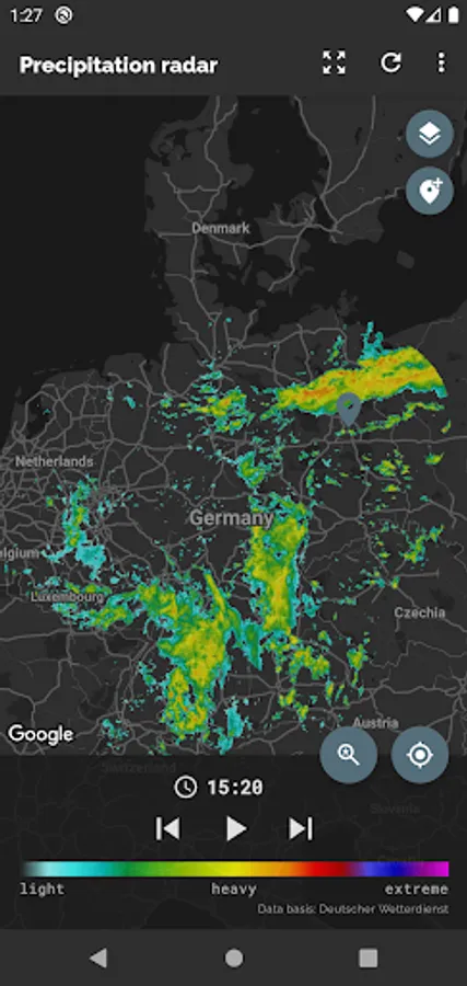 The app Wetterradar provides visualization of precipitation radar images and other features for the area of Germany. Please note, that the app covers only Germany and parts of its neighboring countries.