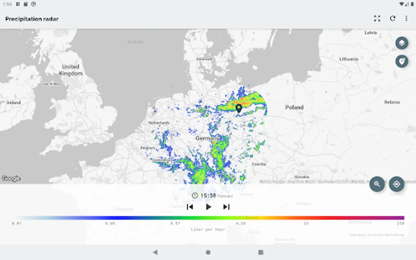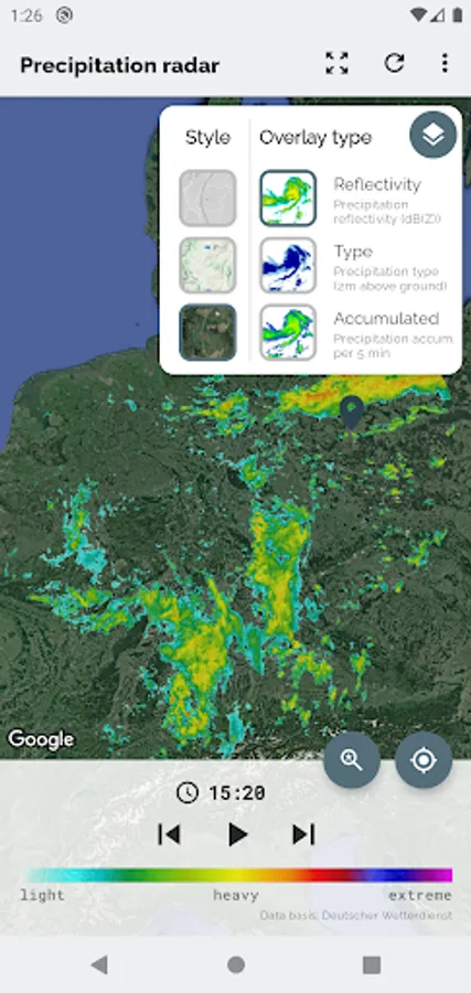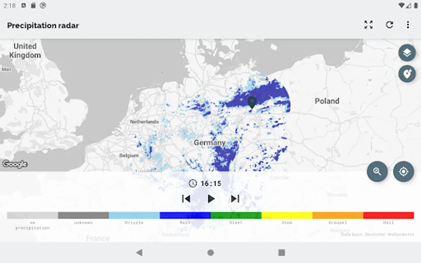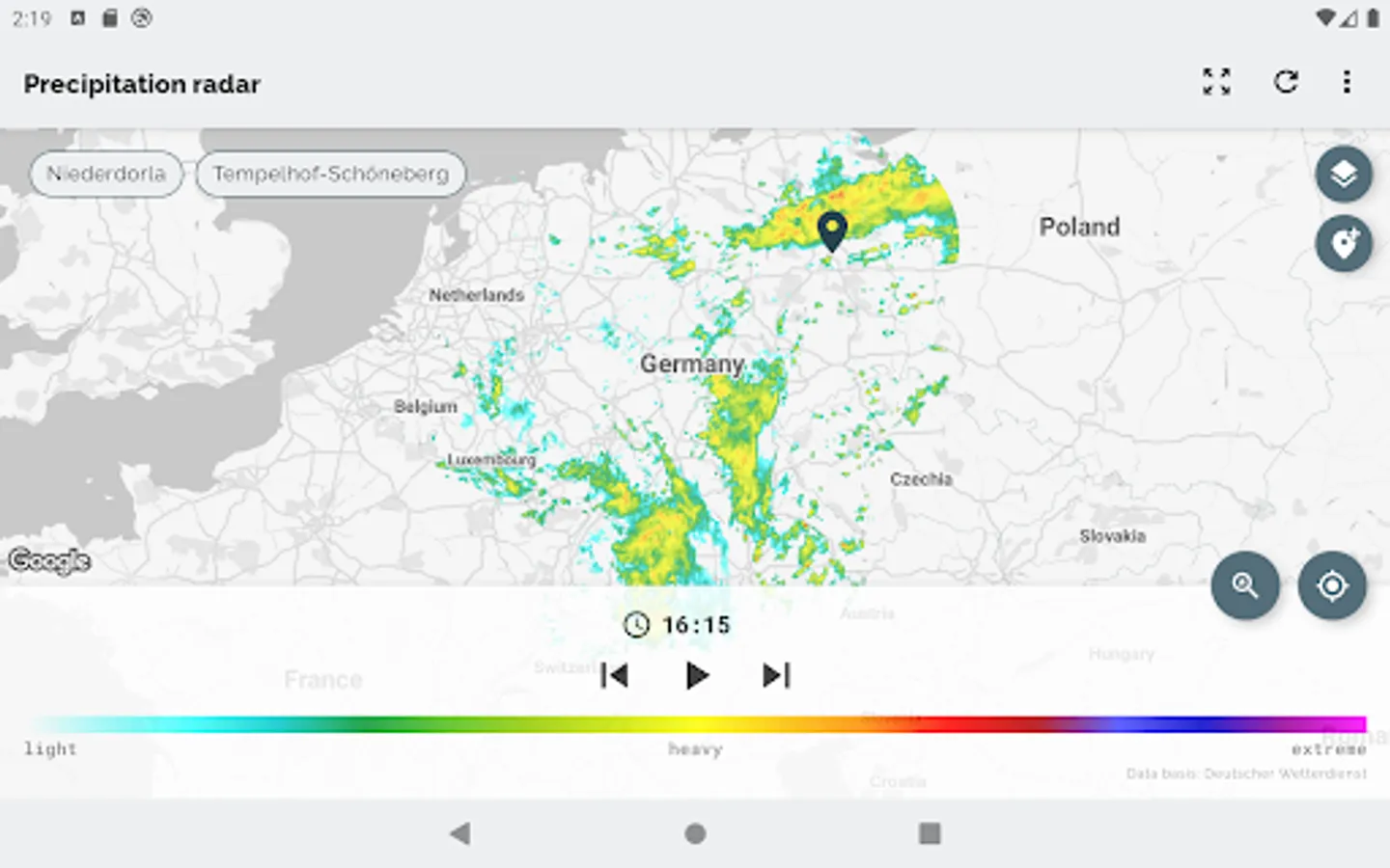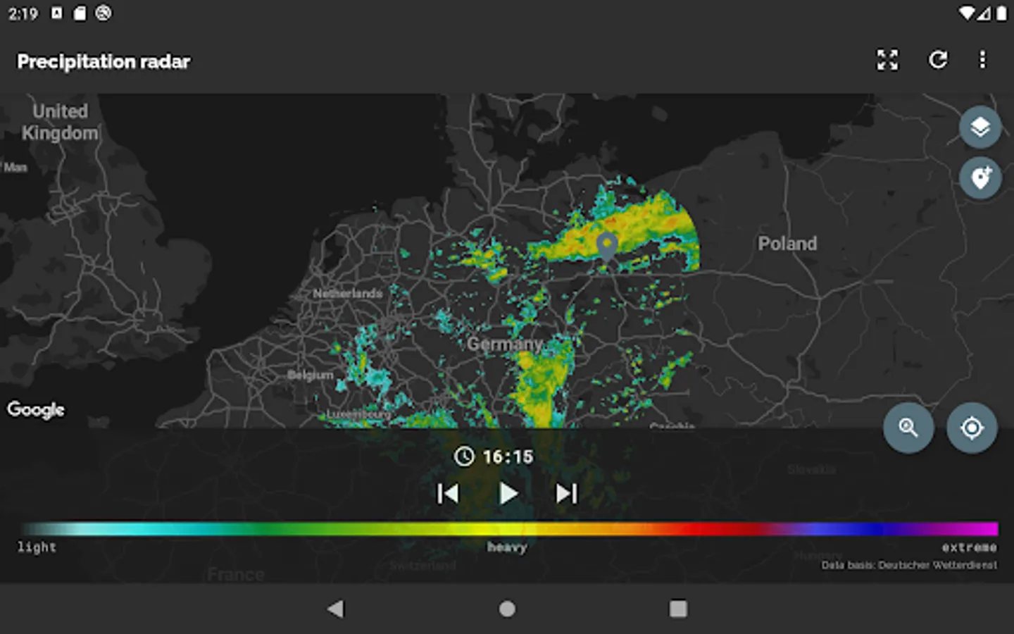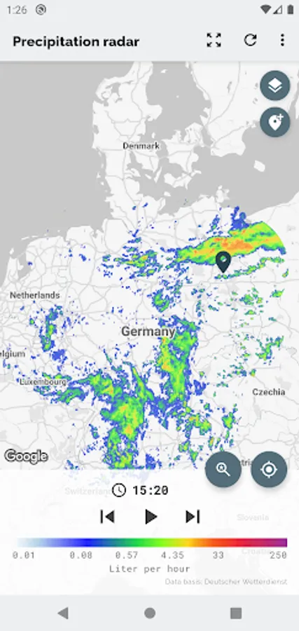 The app Wetterradar provides visualization of precipitation radar images and other features for the area of Germany. Please note, that the app covers only Germany and parts of its neighboring countries.