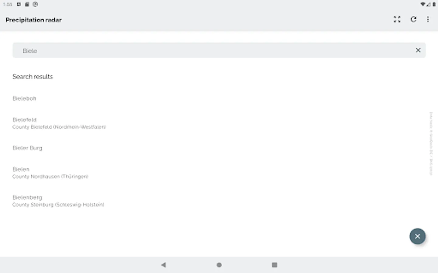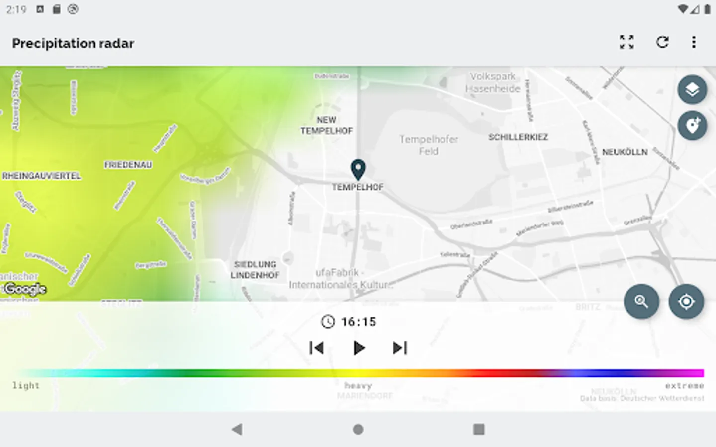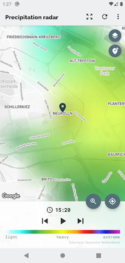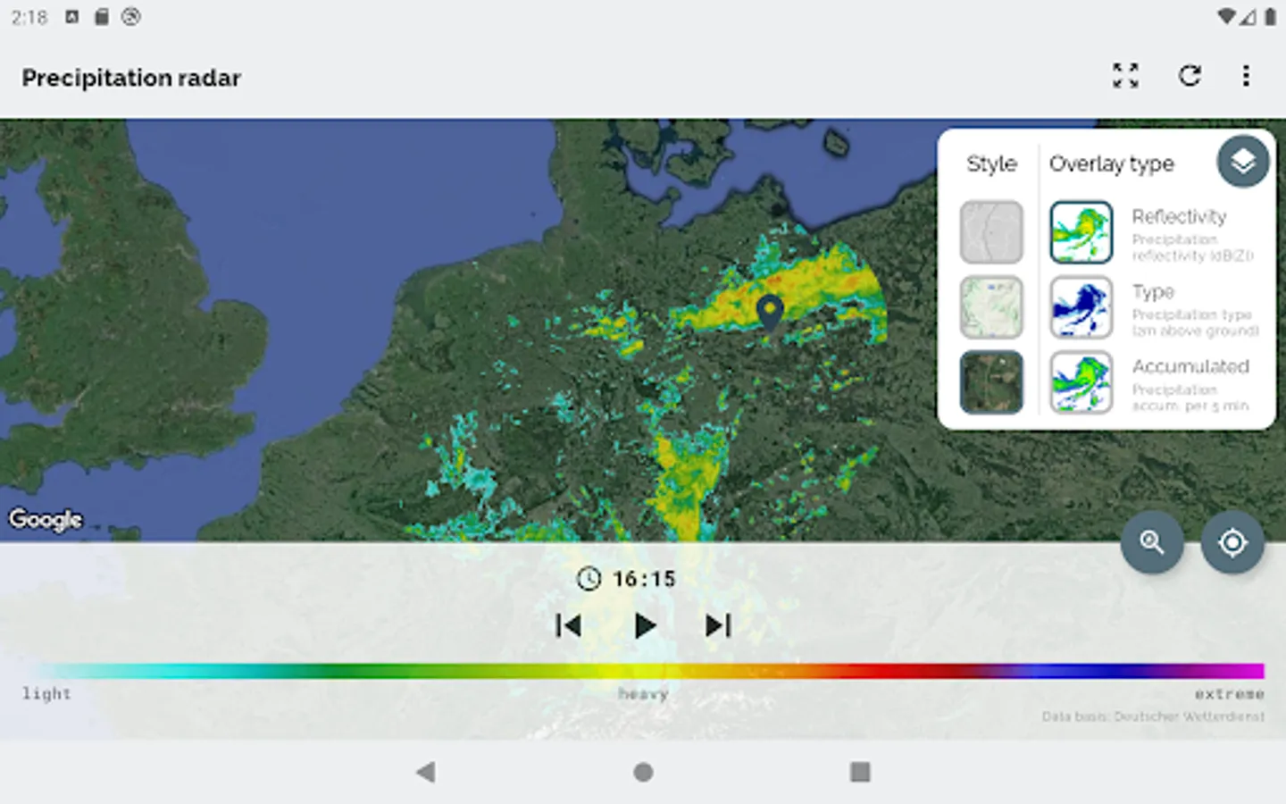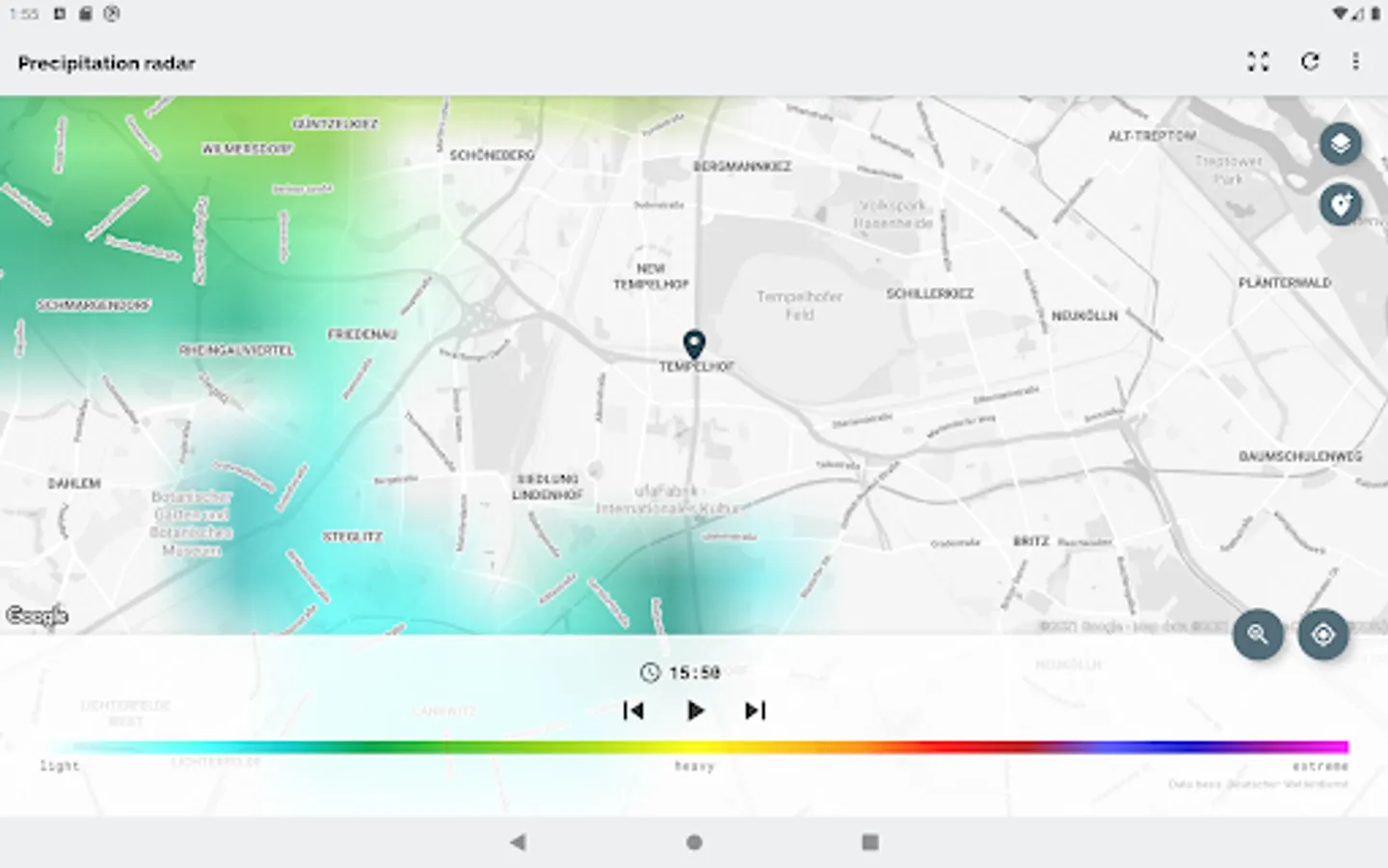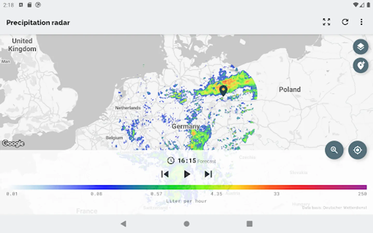 The app Wetterradar provides visualization of precipitation radar images and other features for the area of Germany. Please note, that the app covers only Germany and parts of its neighboring countries.