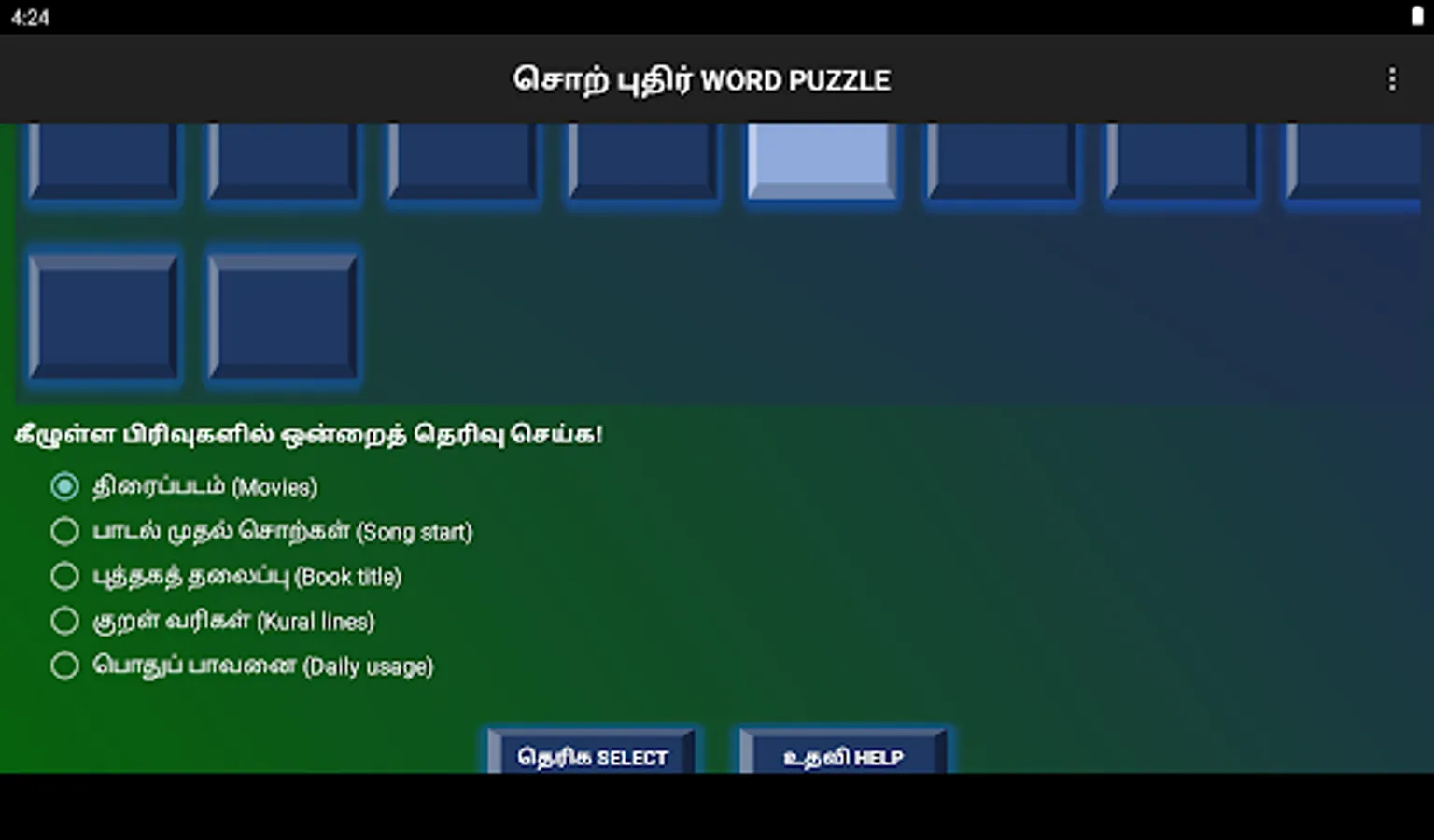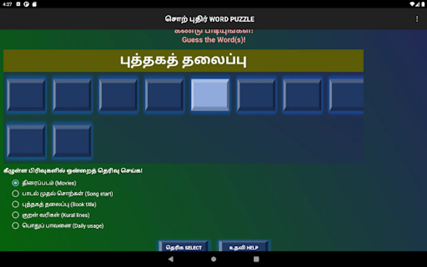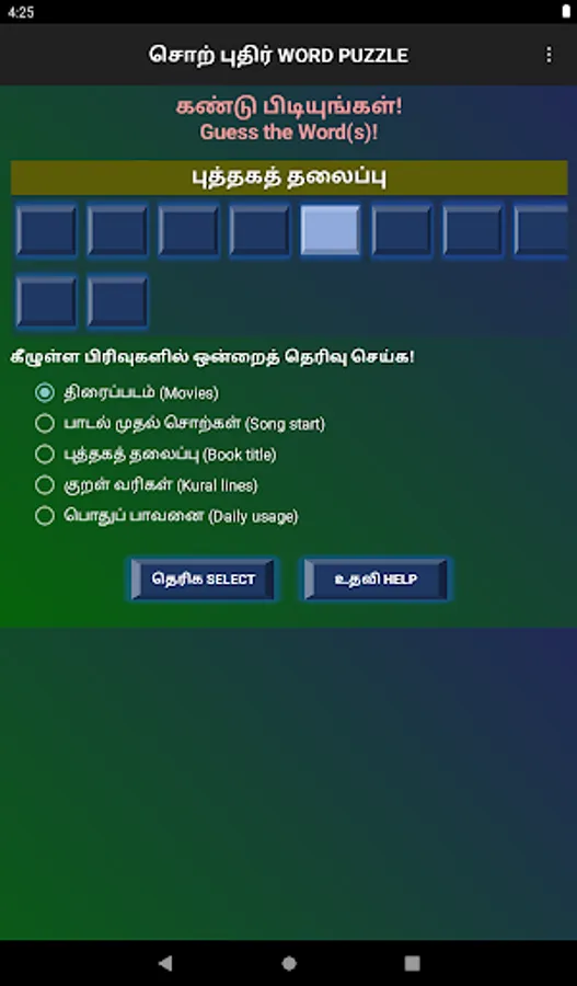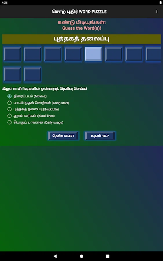 திரைப்படம், பாடல் வரிகள், புத்தகத் தலைப்புகள், திருக்குறள் வரிகள் மற்றும் பொதுப்பாவனையிலிருக்கும் சொற்கள் எனவாகத் தெரிவு செய்யலாம்.