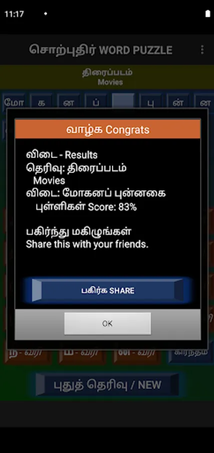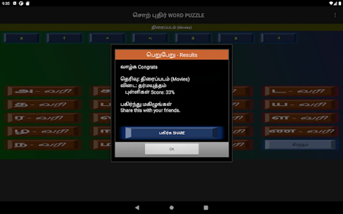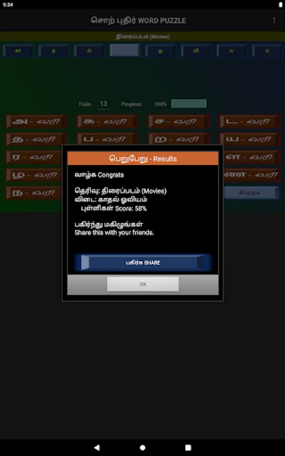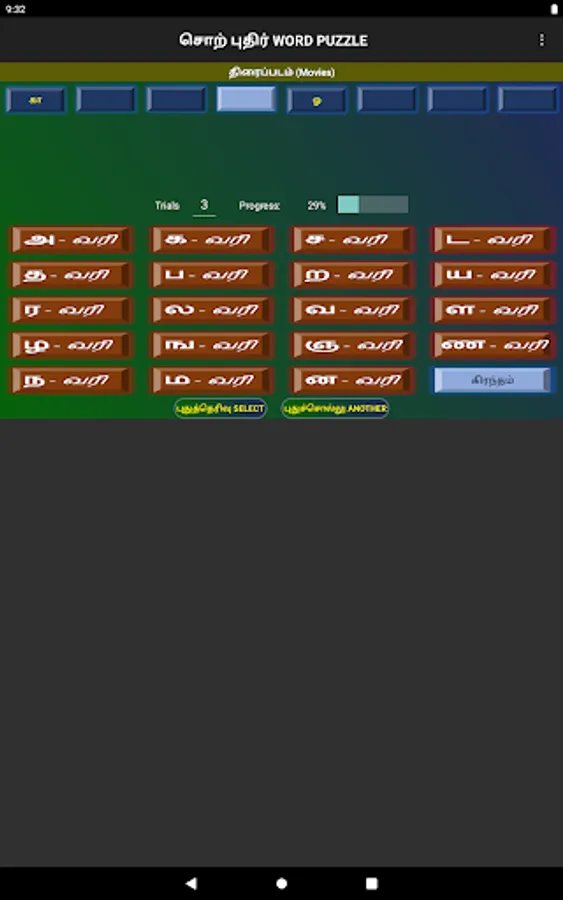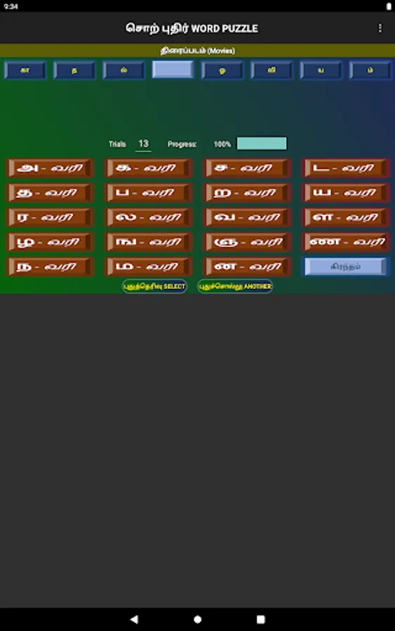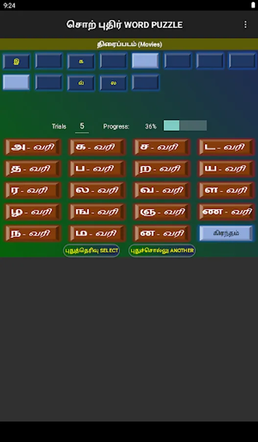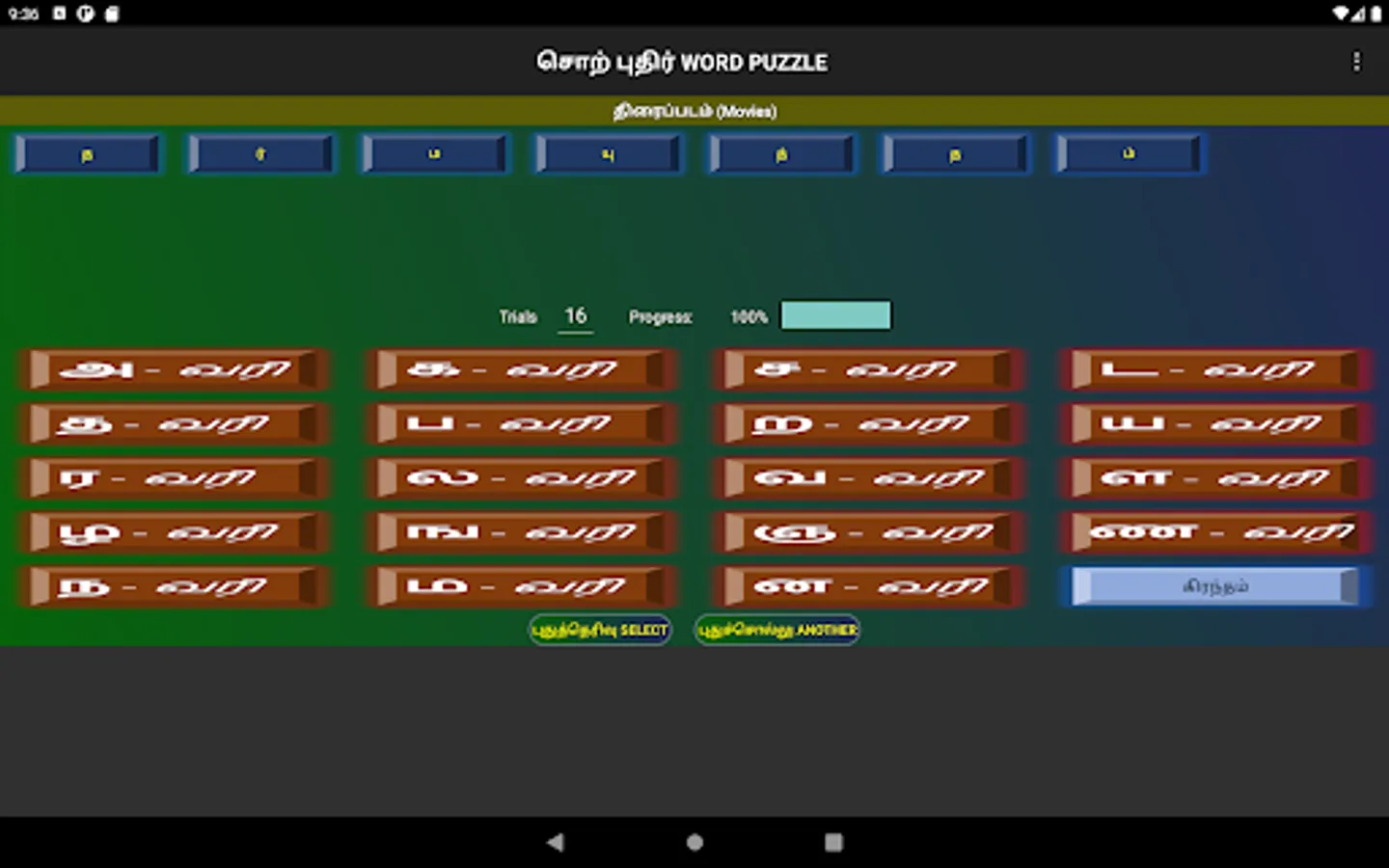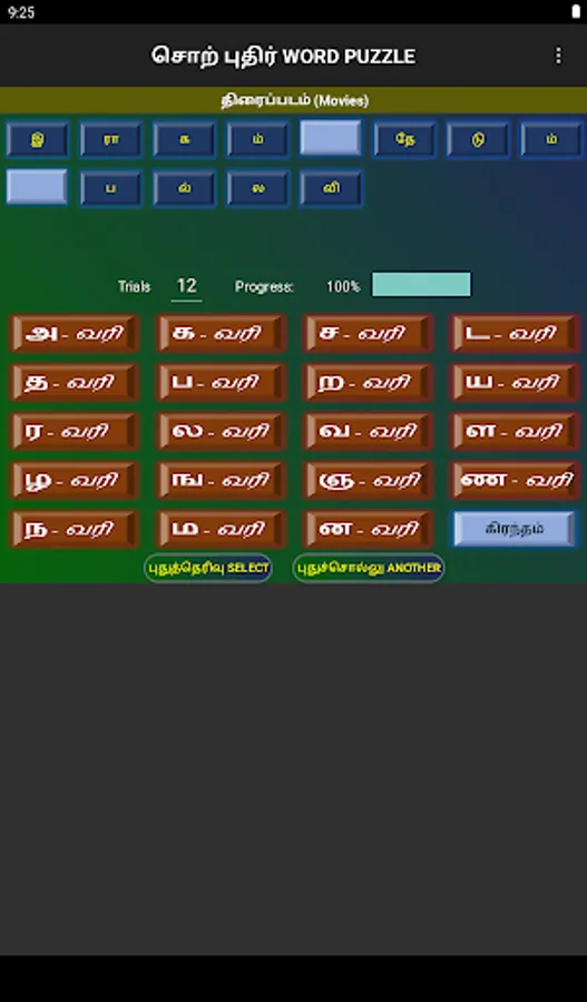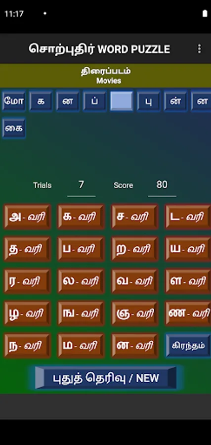 Words can be selected from Movie names, Song lines, Book titles, Thirukural lines, or daily general usage.