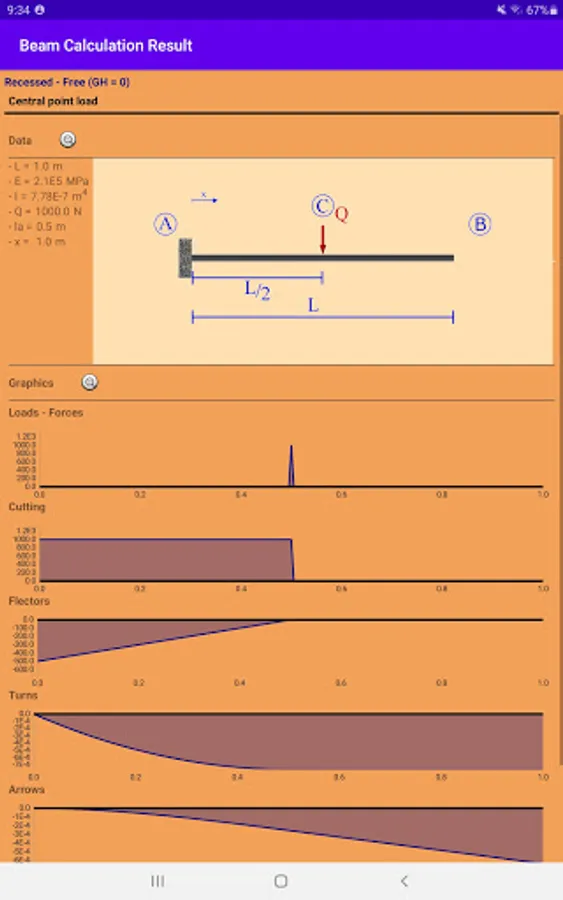 - Diagrams of loads (forces and moments), shear, bending, turns and arrows.