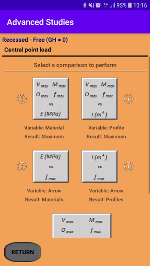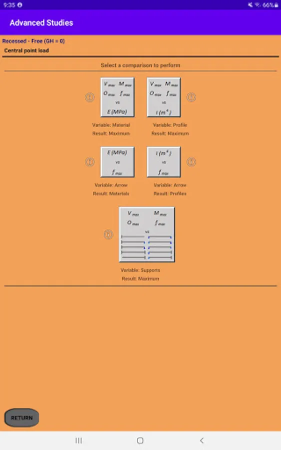 e) Comparative table for different supports of the beam with the same material, profile and loads.