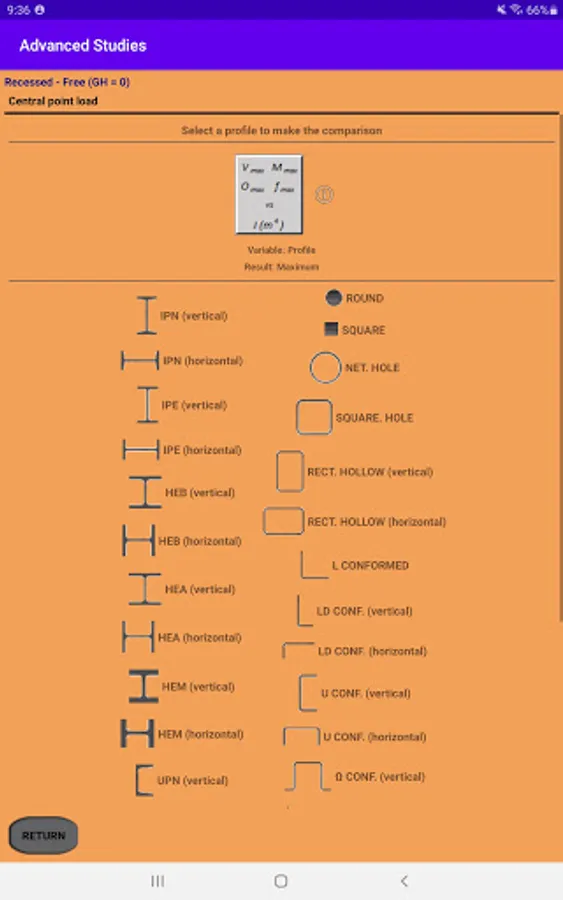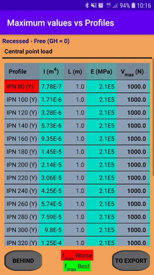 b) Comparative table for different profiles of a family with the same supports and loads.