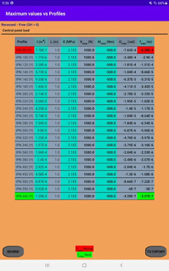 - Numerical results in extremes, intermediate and maximum key points and in a specific position chosen by the user.