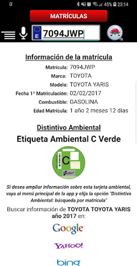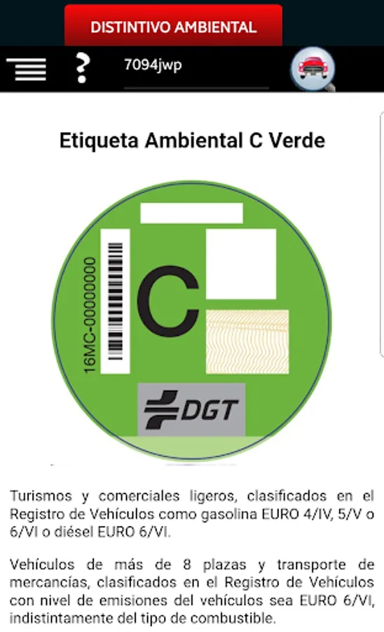 -Write the registration and DNI (NIF, NIE) and you will know the exact date of registration (day, month and year), Make, Model, Fuel, Age and Environmental Distinction.