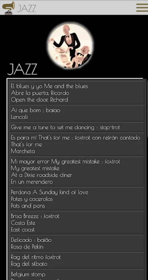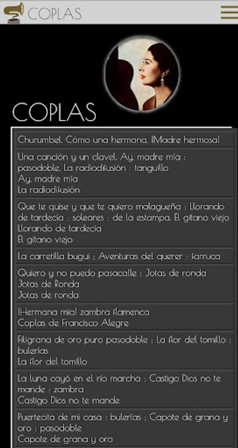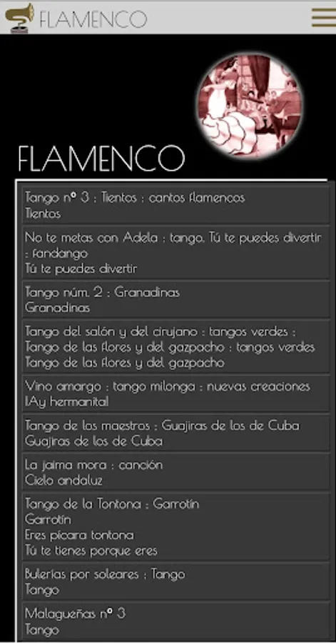 Blues, Boleros, Concerts, Cuplés, Jazz, Flamenco, Fox-trot: great voices and orchestras, Frédéric Chopin, Gershwin Brothers, Masters of the couplet: Quintero, León and Quiroga, Masters of the zarzuela of the XIX: Barbieri, Chapí, Chueca and Bretón, Choral music, Music for movies, Religious music of the XVII and XVIII: masses and motets, Italian musicians in Spain, non-musical sound registers: speeches, recitals, stories, humor ..., Symphonies, Tangos: Carlos Gardel, Wagner , Operas, Wax discs, Perforated discs and Pianola rolls.