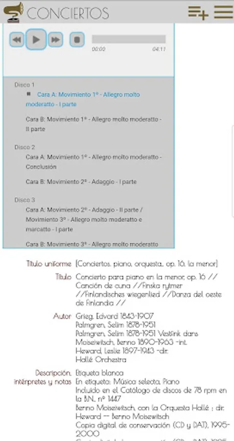 This App allows you to reproduce on your mobile, thanks to the open data policy of the BNE, authentic discographic gems, as well as having a very complete database.