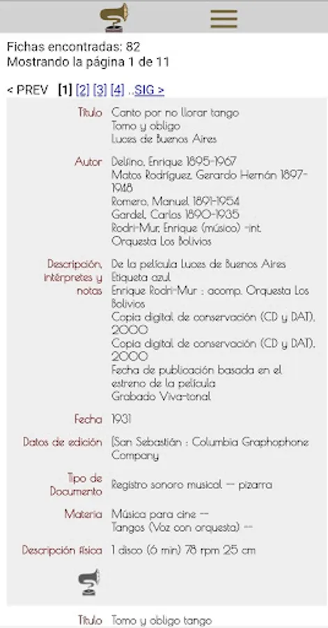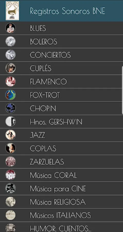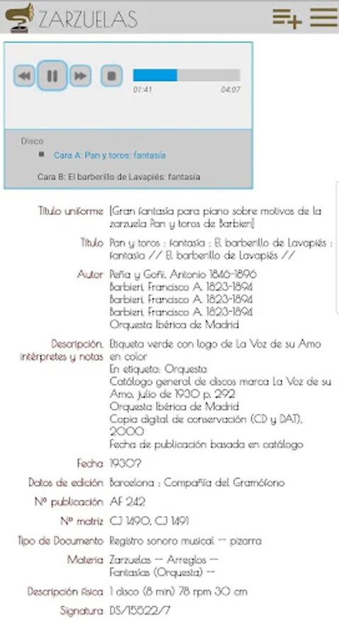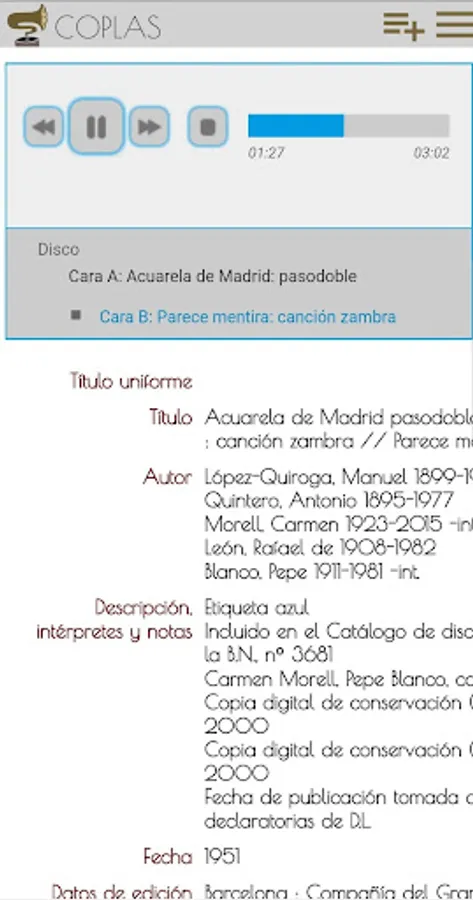 This App allows you to reproduce on your mobile, thanks to the open data policy of the BNE, authentic discographic gems, as well as having a very complete database.