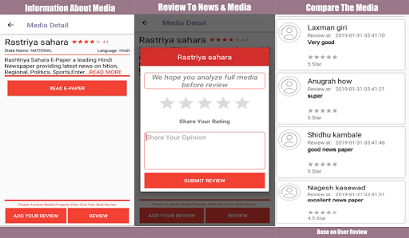 App Is providing the user review audit and rating system, User Can Upload the media and News and others will provide his opinion and rating on News and media with the rating.