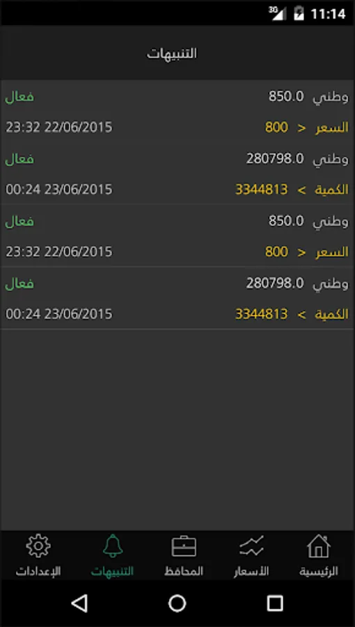 ممكن اعداد تنبيهات على اساس السعر و التغير و الكمية المتداولة