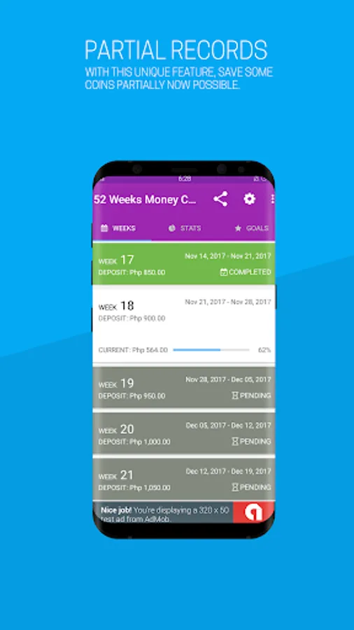 The app is flexible, you can define how much you need to save each week and the saving amount increases. You can make a deposit in your piggy bank saving container as small as you can and reward yourself an ice cream after you completed the whole 52 weeks money challenge!π