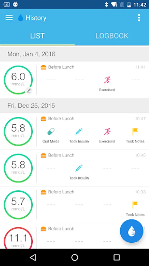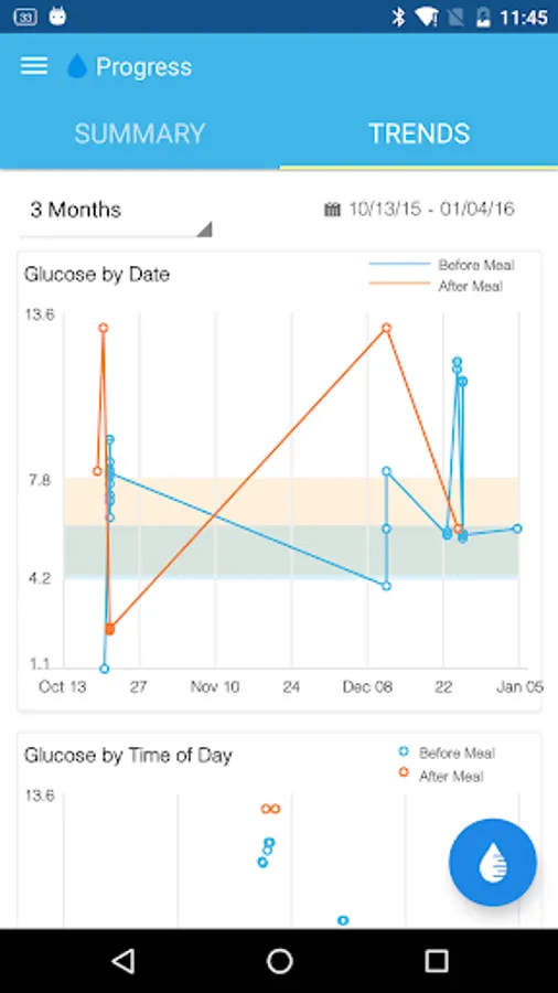 Manage – Review a digital logbook with details of the measurement, including time stamp, date and tags. See stats and trends of key time periods broken out by day part and meals.