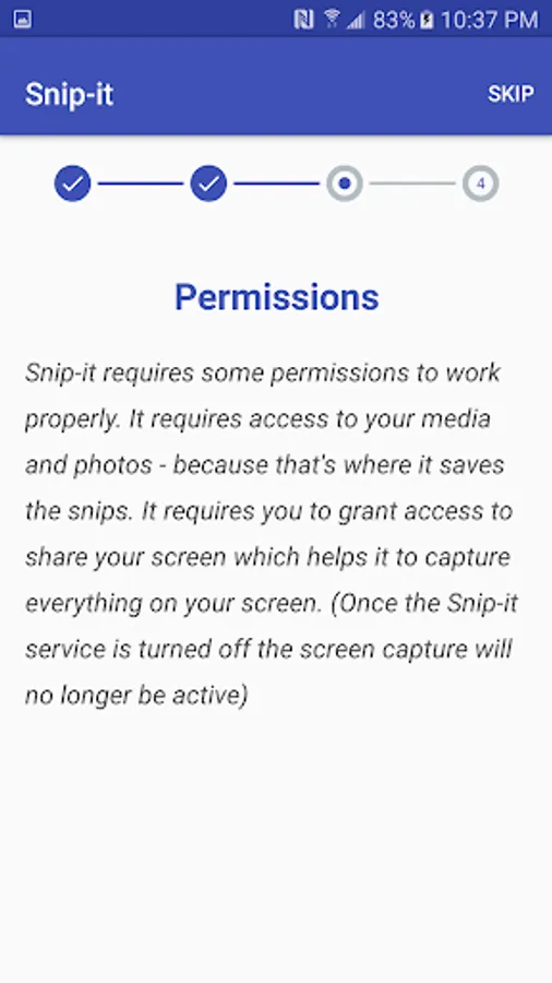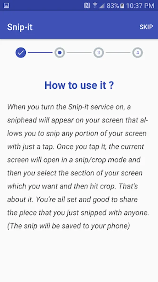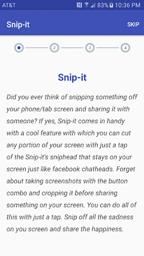 Did you ever think of snipping something off your phone/tab screen and sharing it with someone? If yes, Snip-it comes in handy with a cool feature with which you can cut any portion of your screen with just a tap of the Snip-it's sniphead that stays on your screen just like facebook chatheads. Forget about taking screenshots with the button combo and cropping it before sharing something on your screen. You can do all of this with just a tap. Snip off all the sadness on you screen and share the happiness.