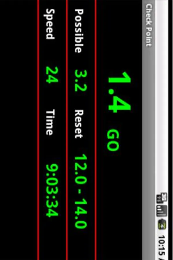 The next possible Check Point mileage is displayed at all times in the 'Possible' field. A yellow alert 'Check Ahead' is displayed for 15 seconds prior to the time of a possible check point. When safe to proceed, the alert changes to a green 'GO'.